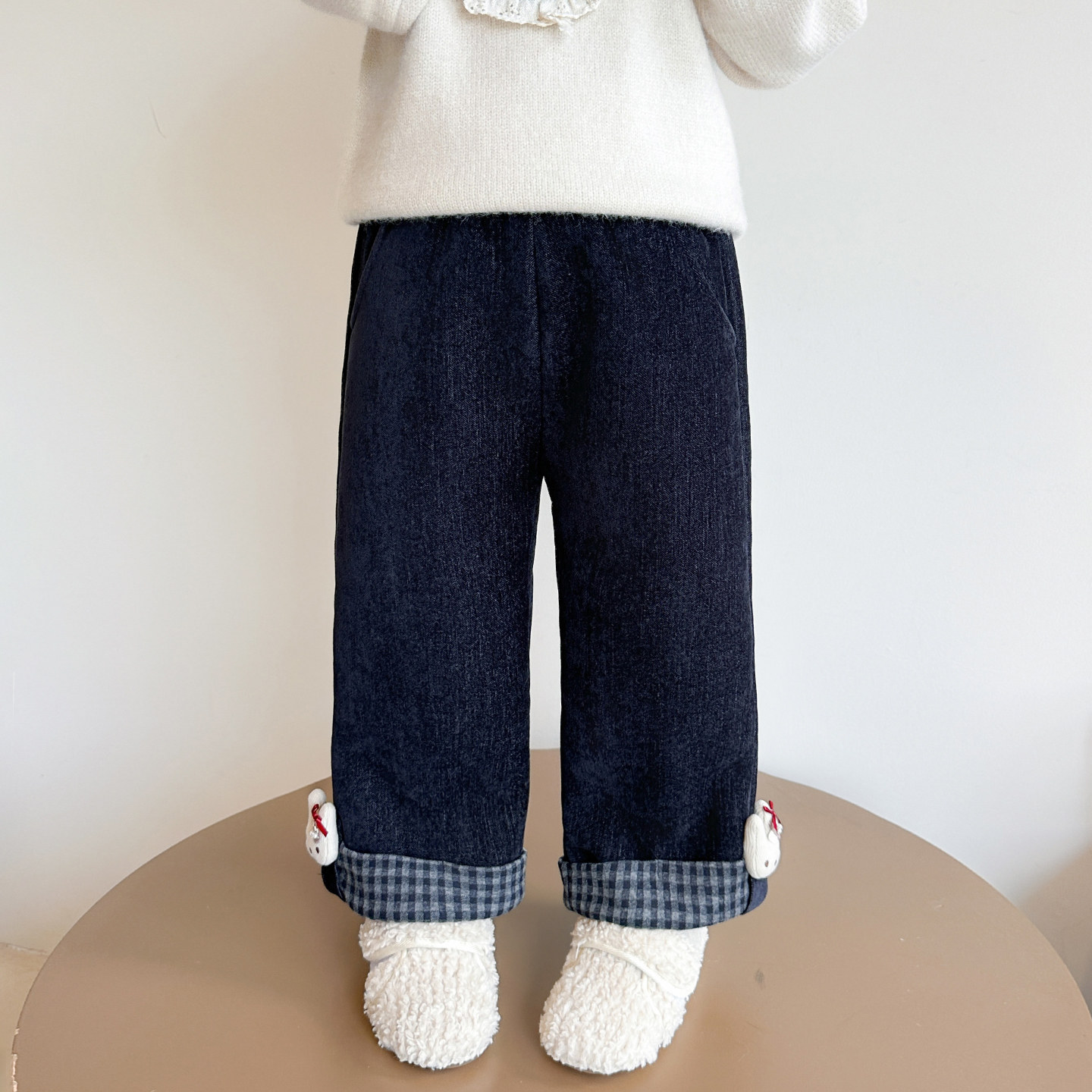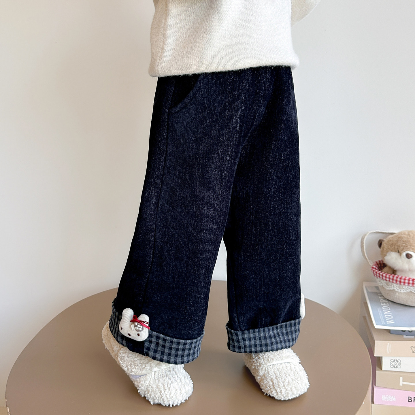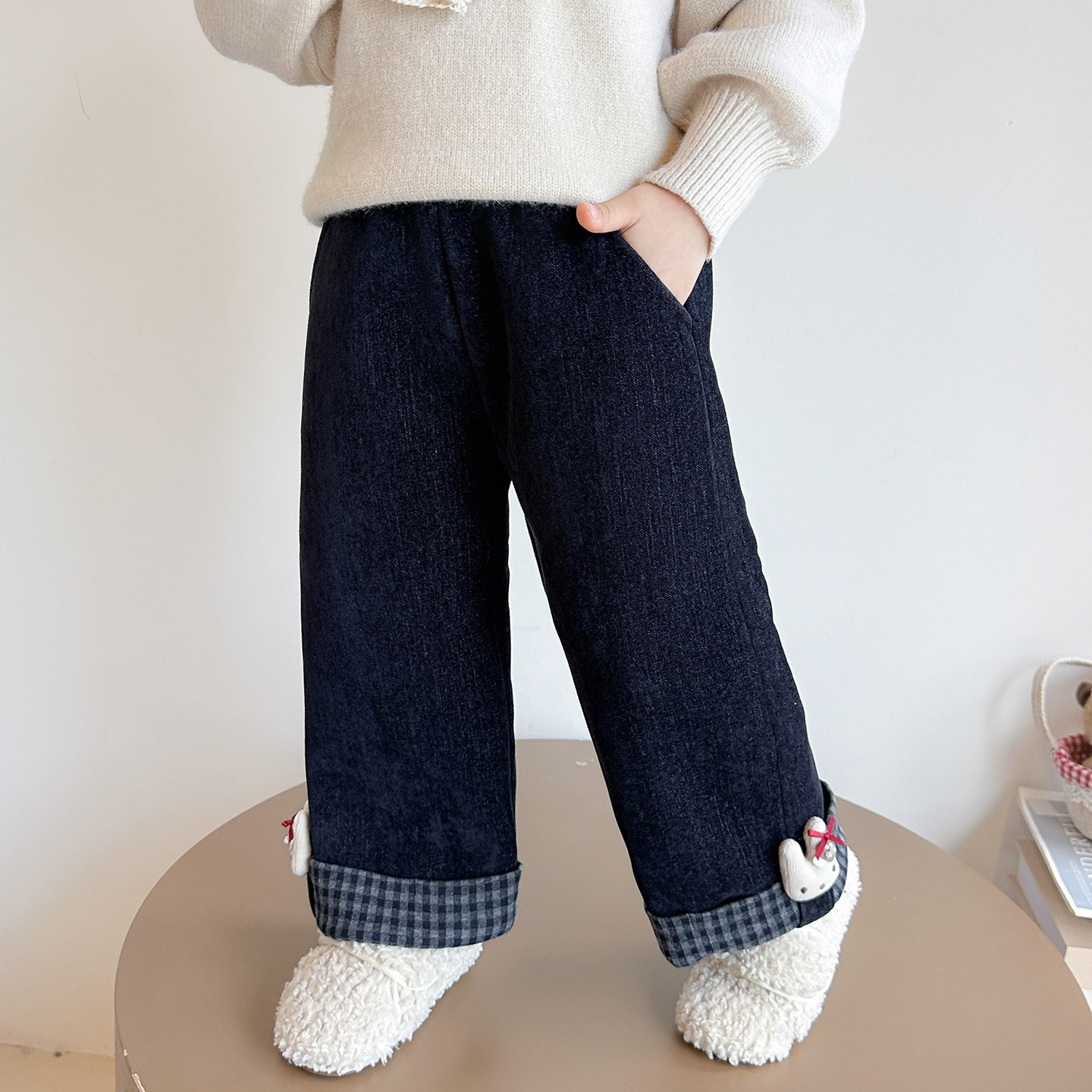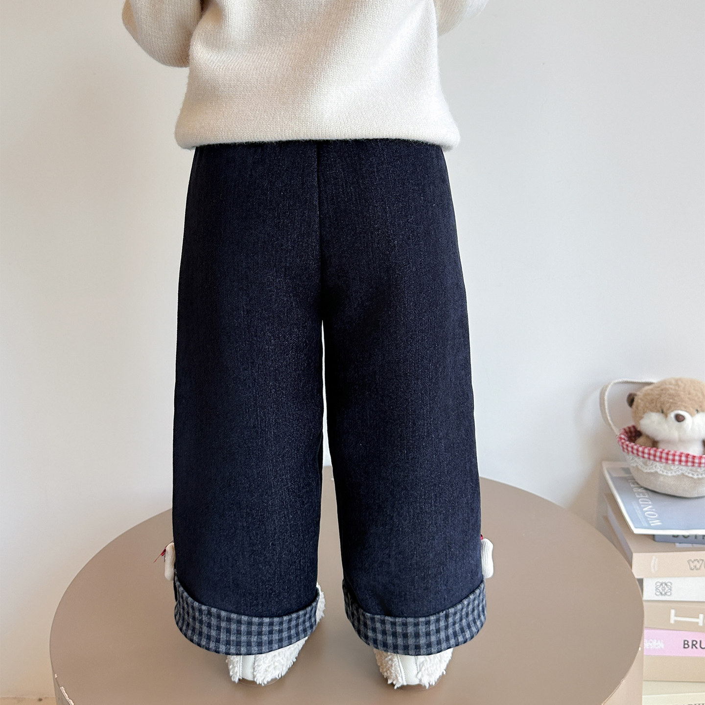 女童加绒裤子秋冬装洋气时髦儿童阔腿裤宝宝一体绒加厚直筒牛仔裤