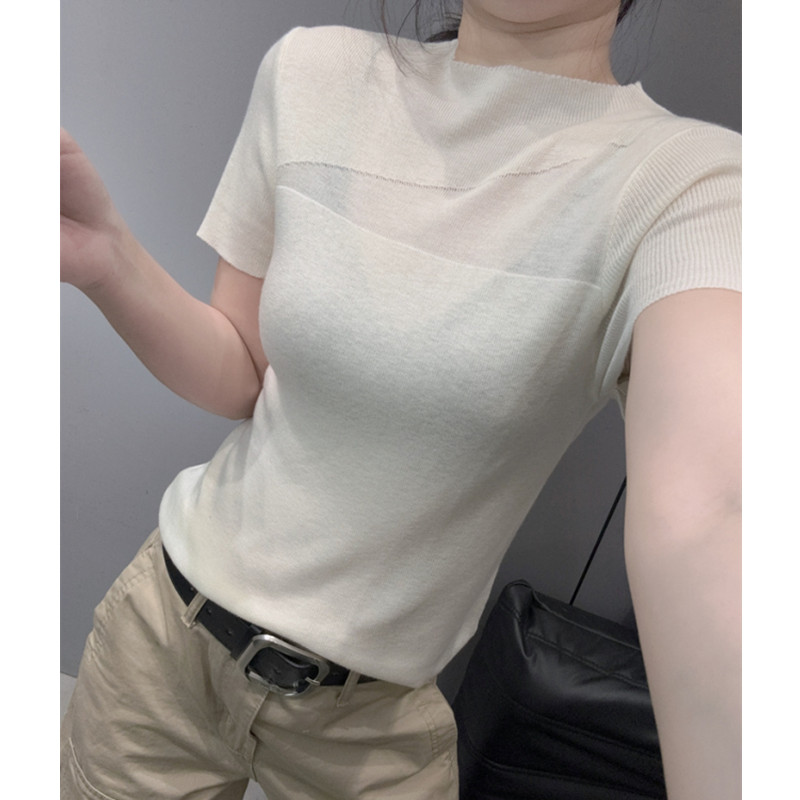 时尚拼接短袖女冰丝针织衫欧洲站气质百搭修身高级感时髦上衣夏季