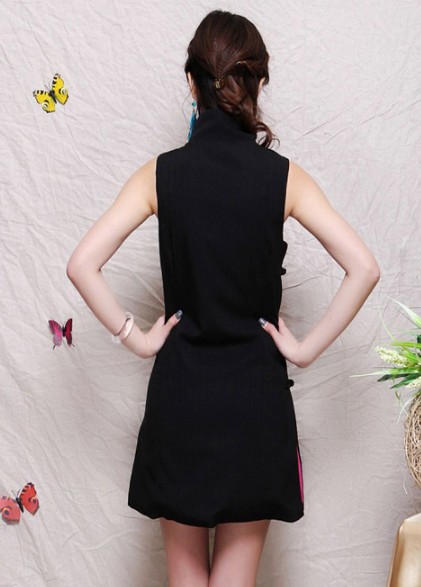2025中国风旗袍短裙女装 春秋 民族刺绣花棉麻无袖连衣裙 马甲裙