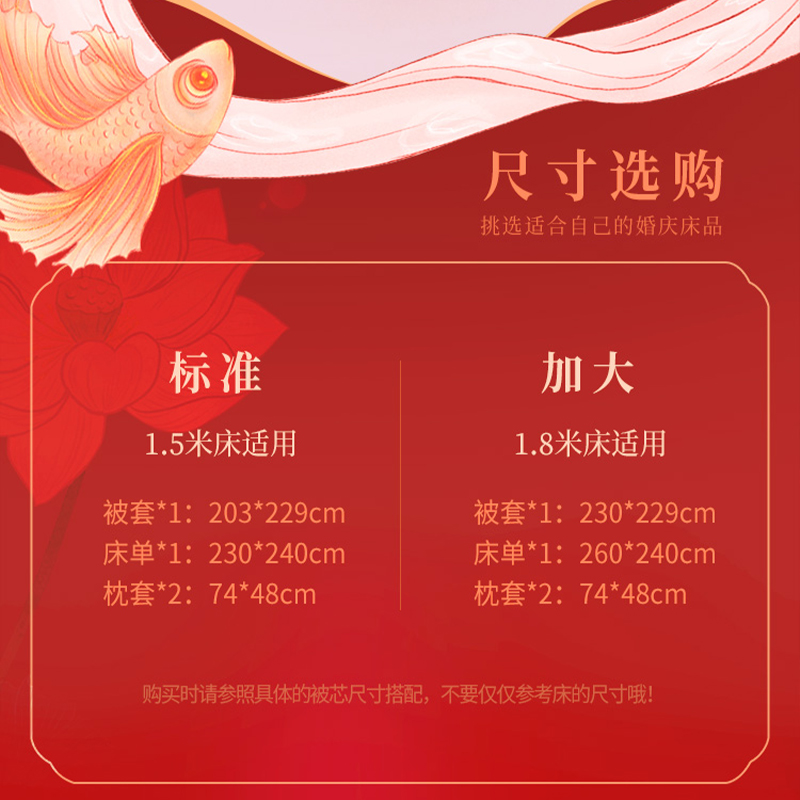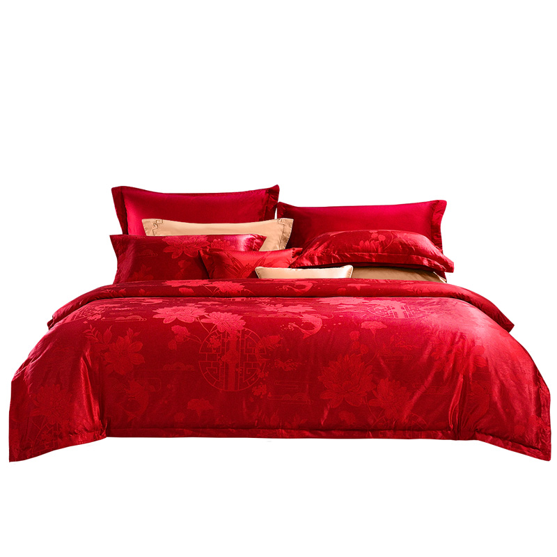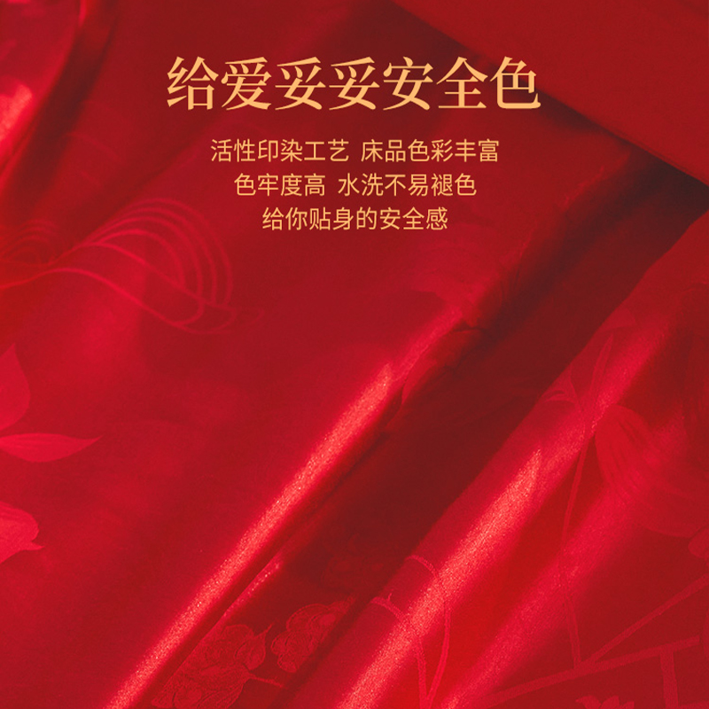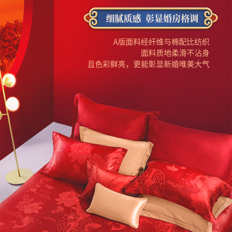 富安娜纯棉提花婚庆四件套大红色结婚六件套床上用品涤棉喜被床单