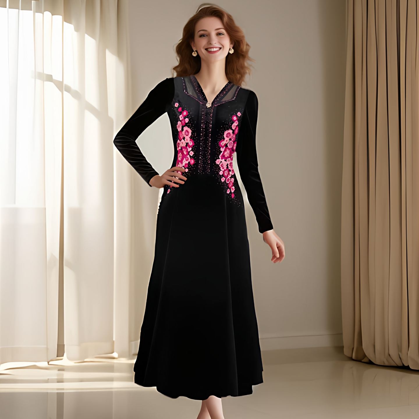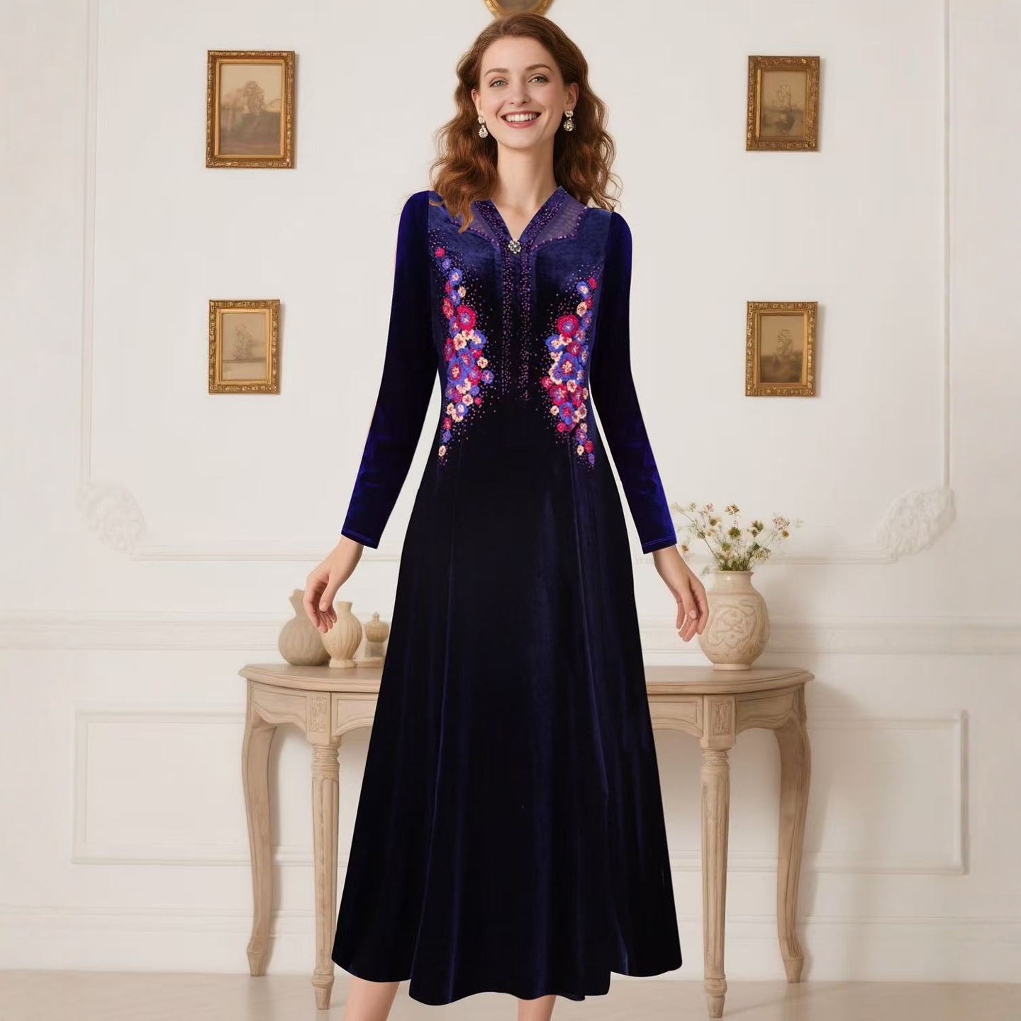 碧阳高端春秋新款优雅妈妈丝绒绣花连衣裙中年女气质显瘦过膝长裙