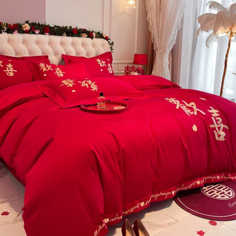 刺绣婚庆全棉四件套大红色床单被套新婚陪嫁结婚床上用品