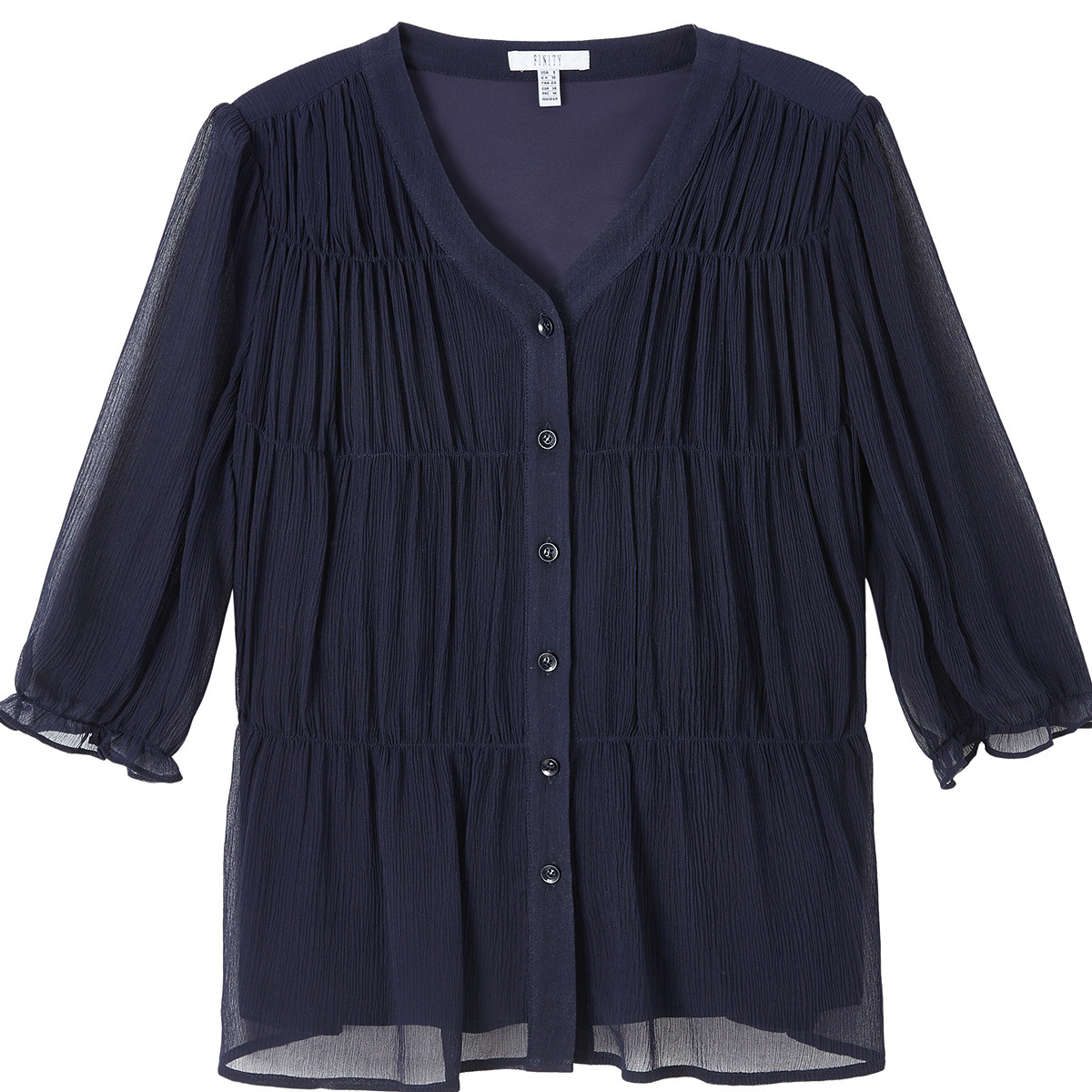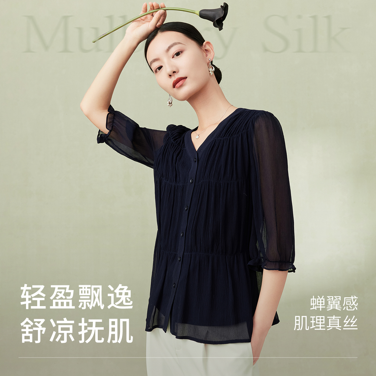 菲妮迪品牌真丝衬衫2025秋新款100%桑蚕丝高端黑色V领花边上衣女