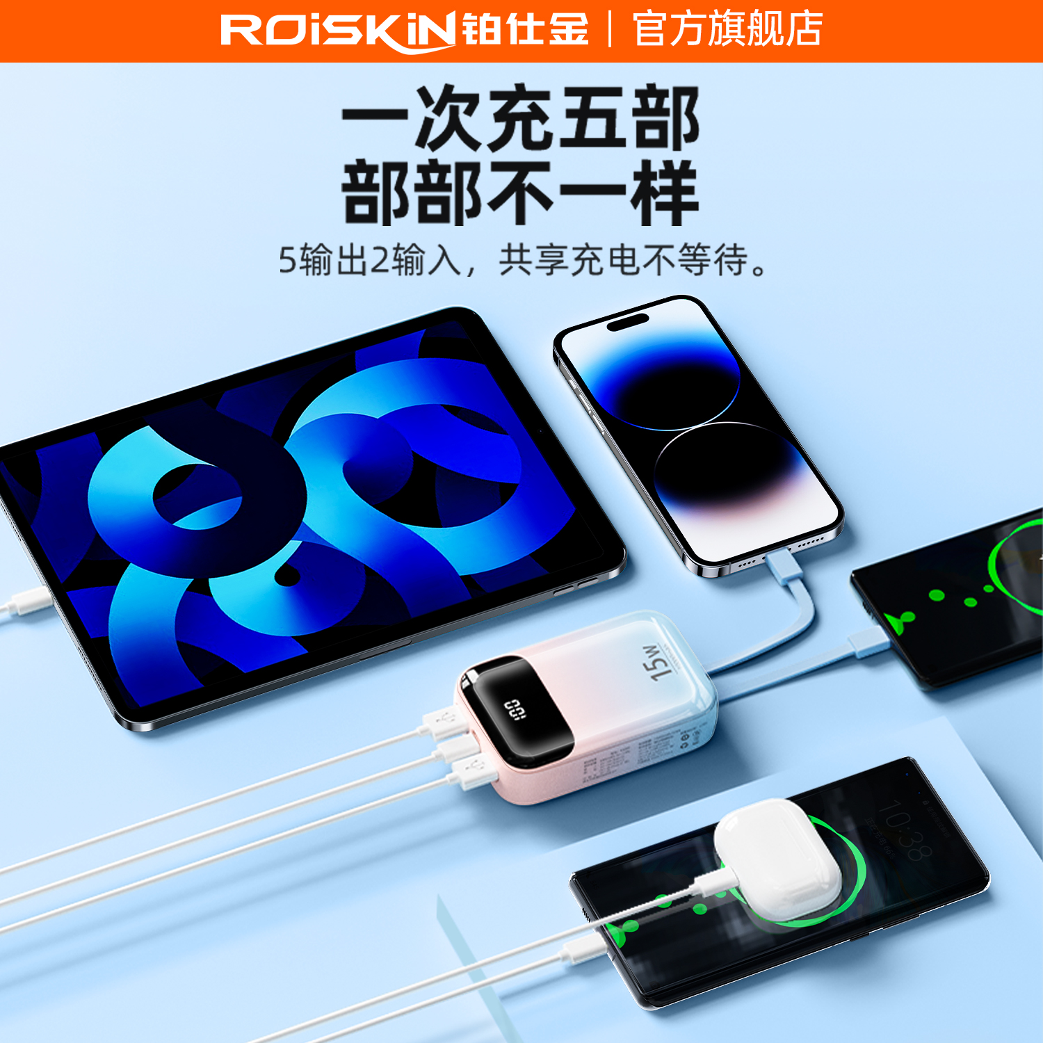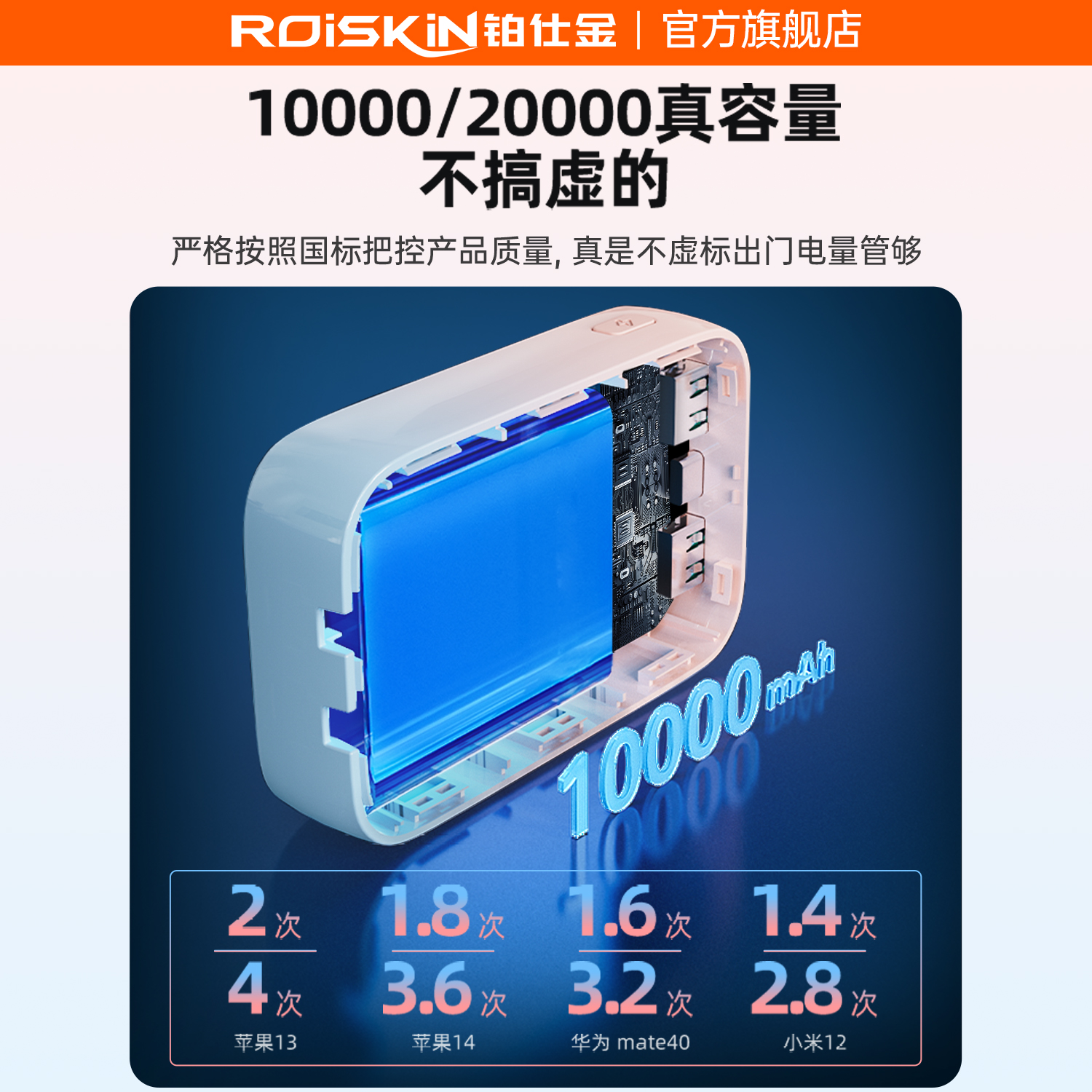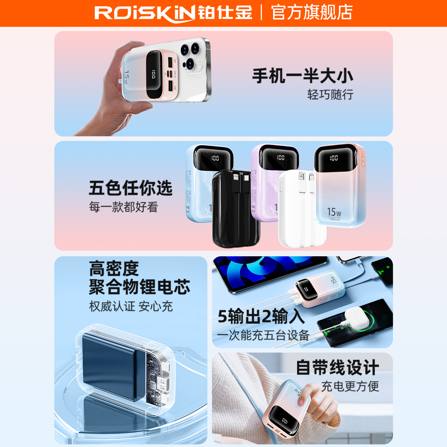 Roiskin充电宝自带线超薄小巧可爱便携小迷你容量超大快充10000/20000毫安适用华为苹果专用小米oppo移动电源
