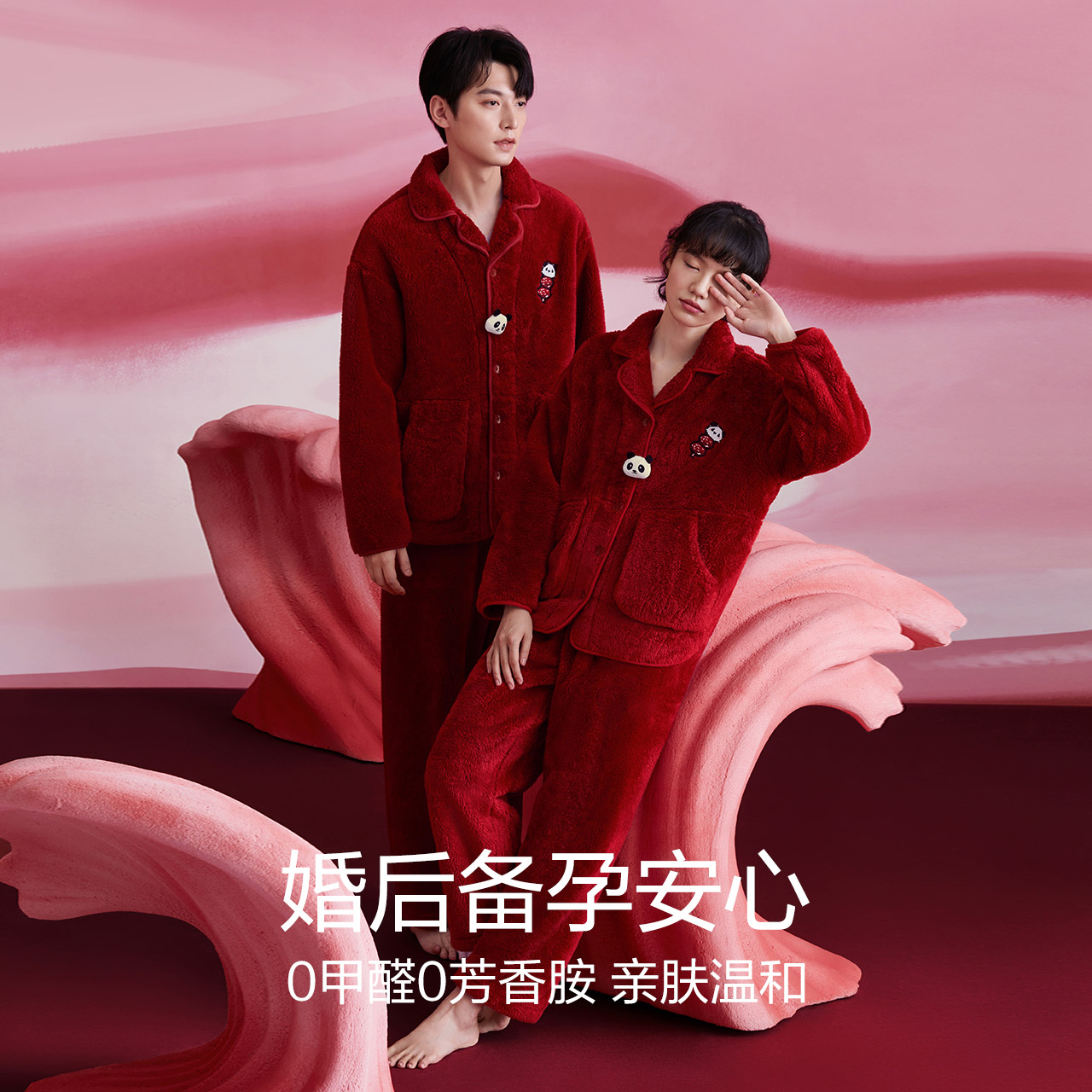 红豆居家本命年红色珊瑚绒情侣睡衣秋冬厚款结婚家居服套装女新年