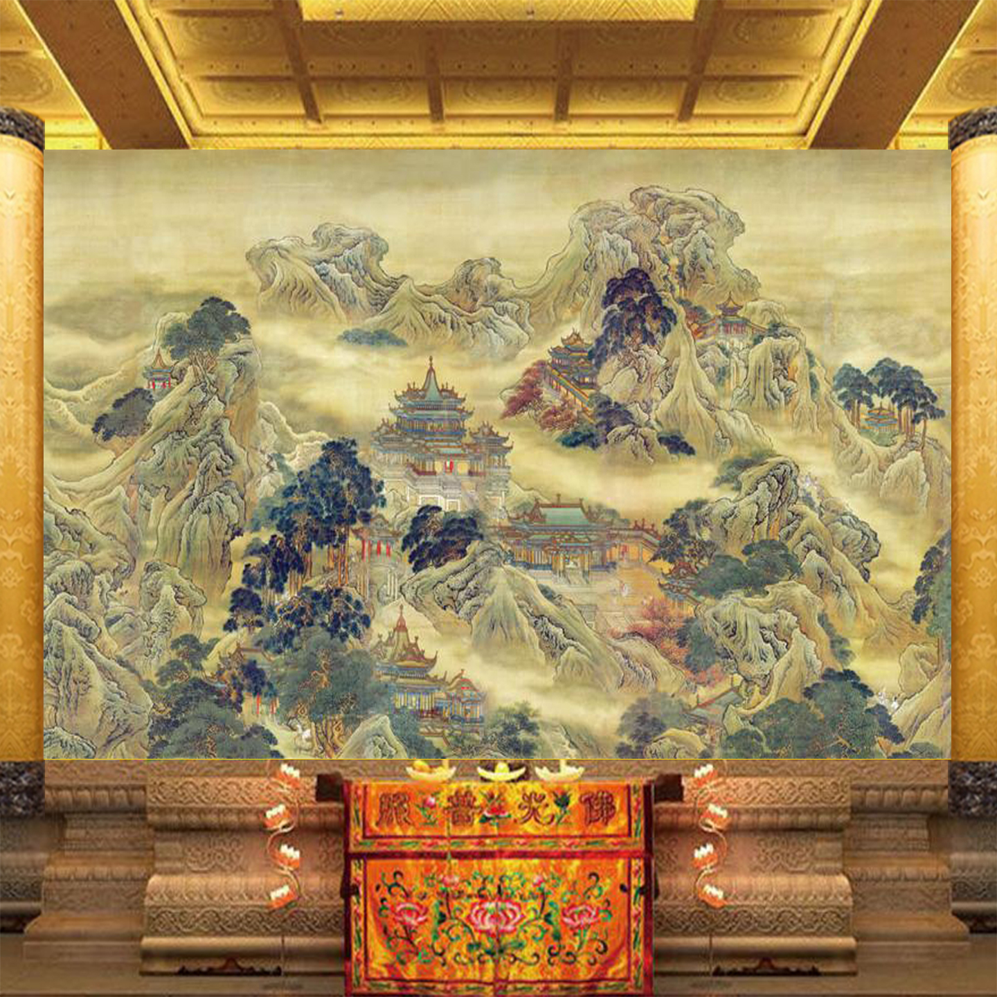 复古蓬莱仙境山水画壁纸宫殿庭院仙家堂口壁画道家神台背景墙纸