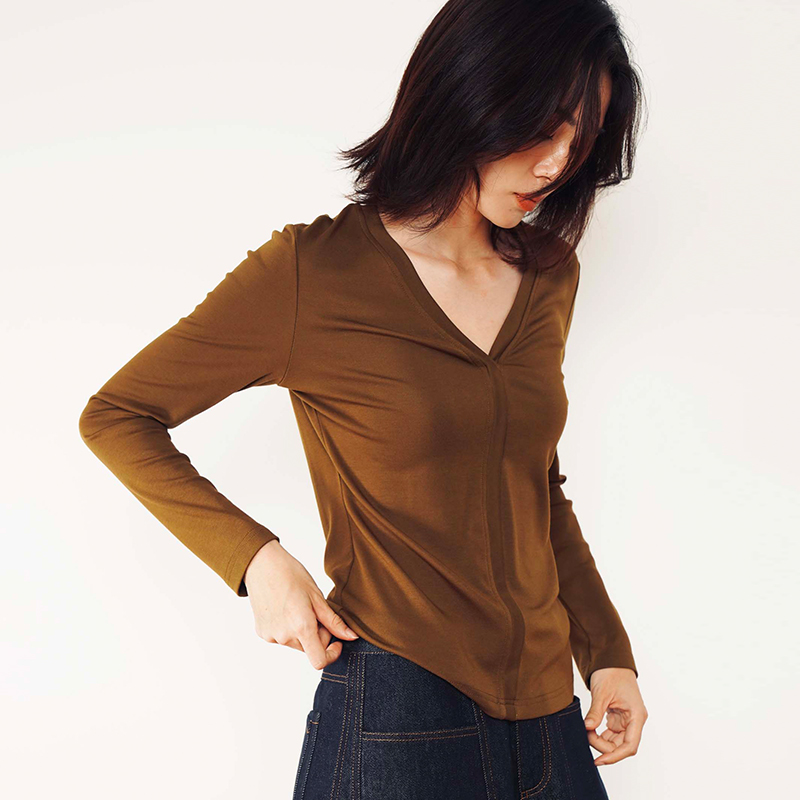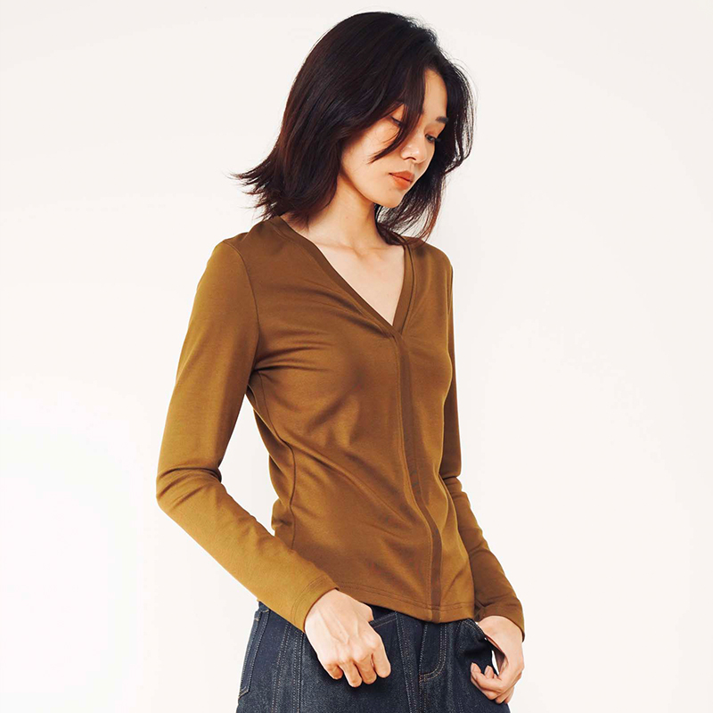 修身显瘦t恤女早秋V领纯色休闲舒适上衣简约百搭打底长袖衫
