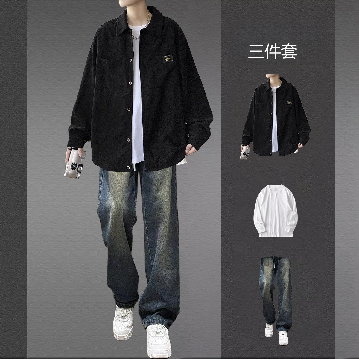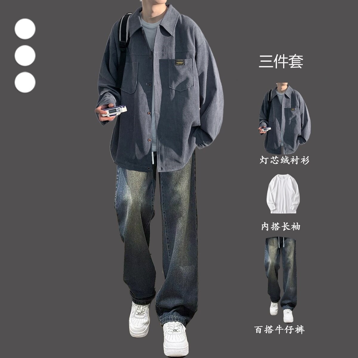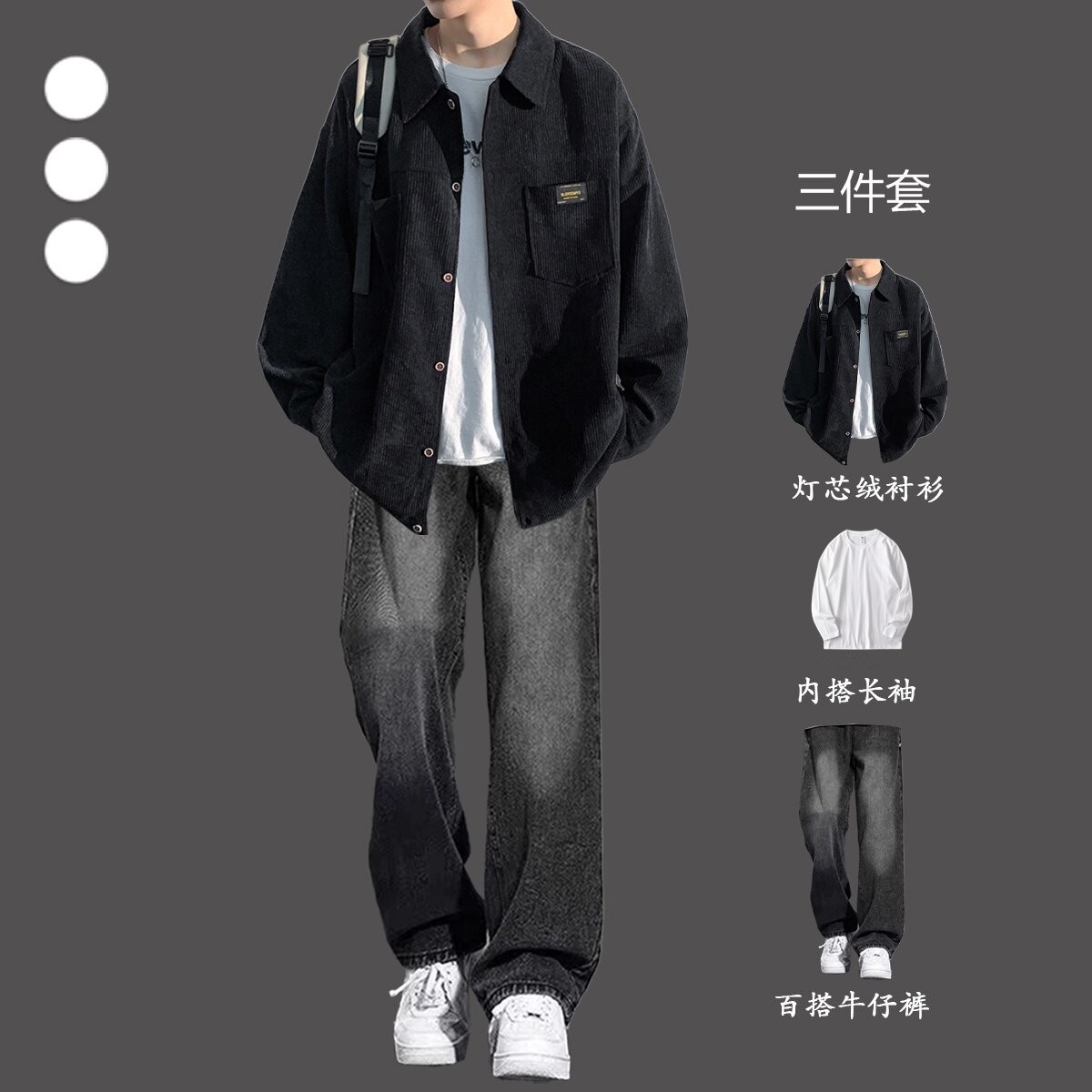 男装春秋季灯芯绒衬衫长袖衬衣外套搭配时髦牛仔裤高级感一整套装