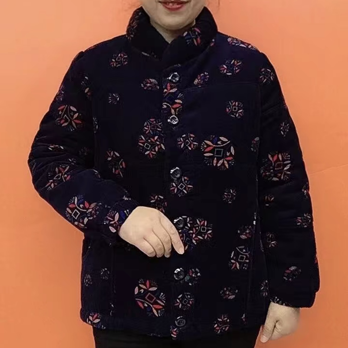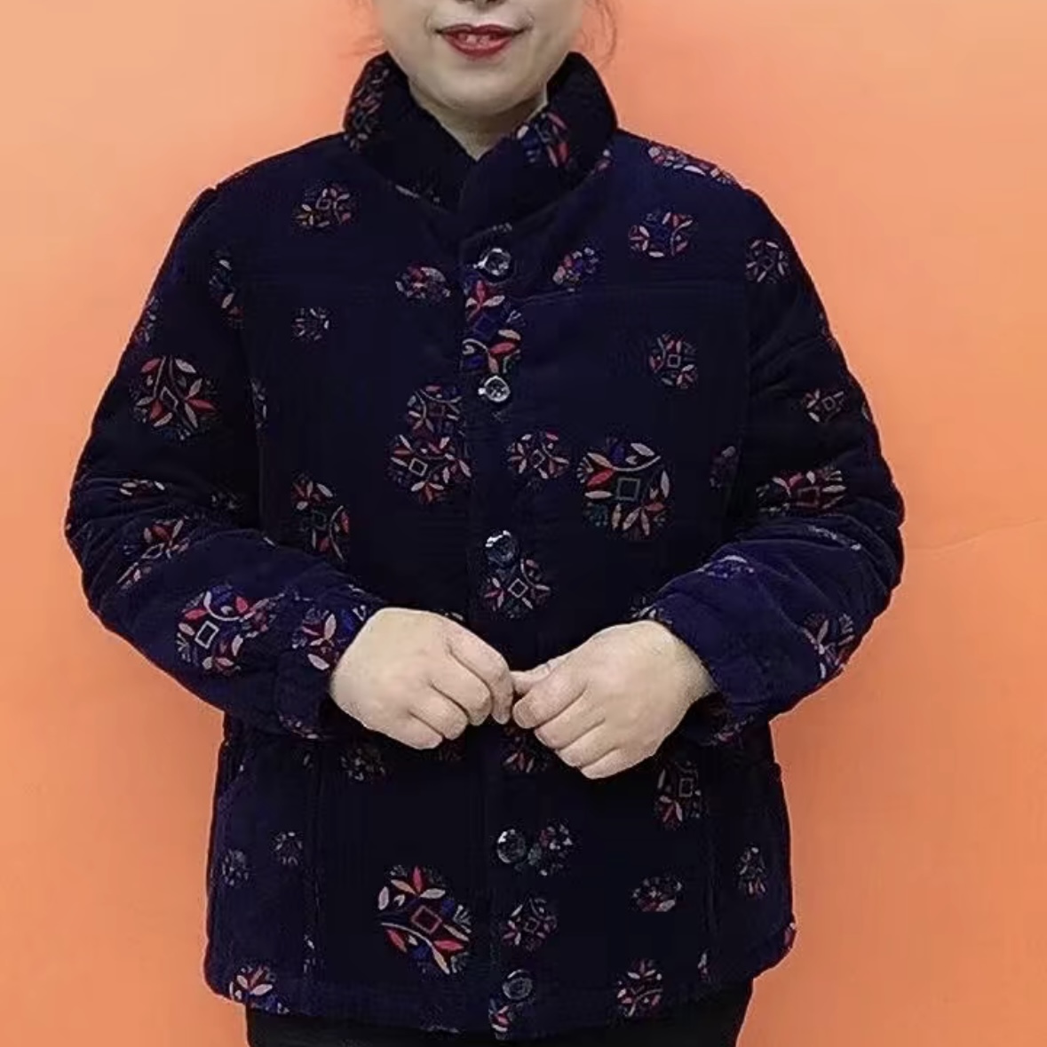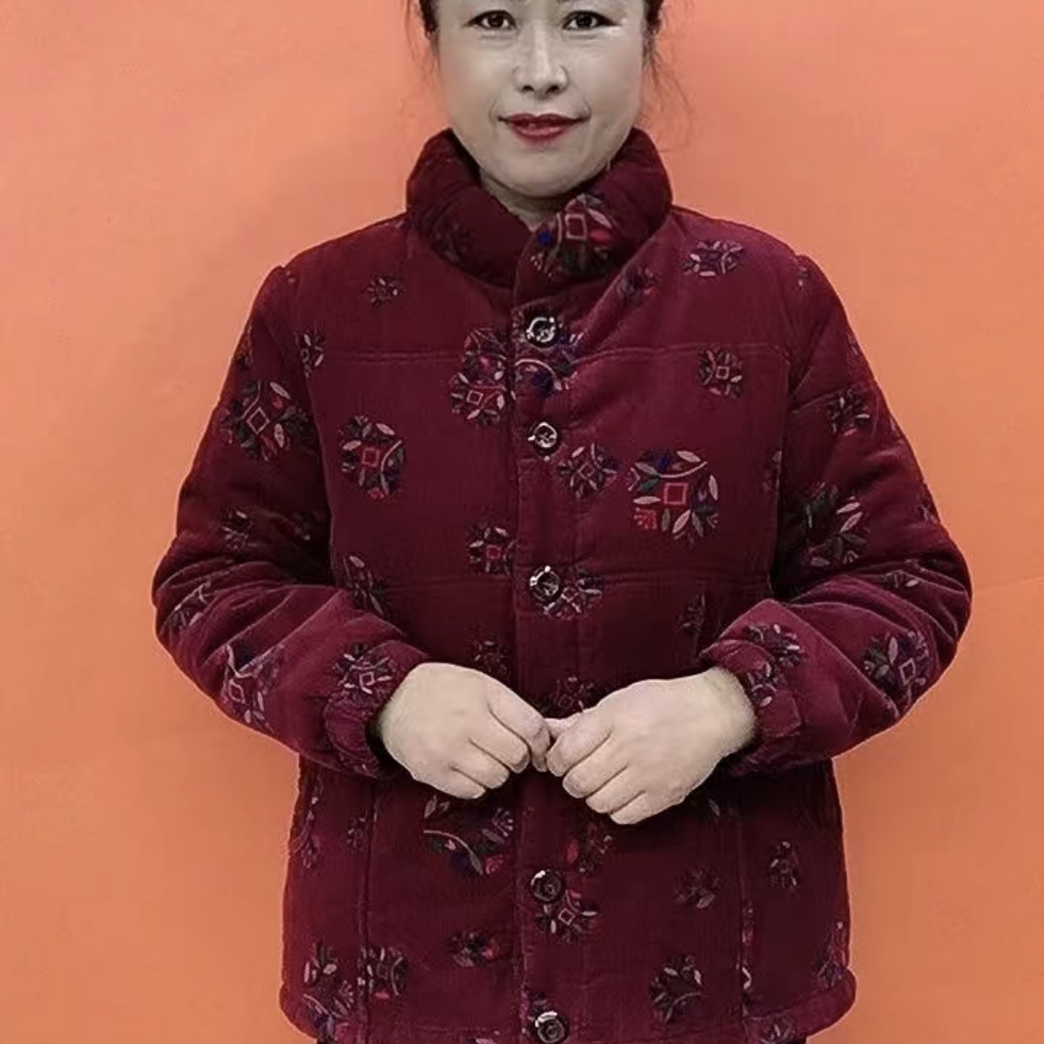 秋冬新款女加绒保暖外套面包领花色洋气中老年妈妈装上衣奶奶棉袄