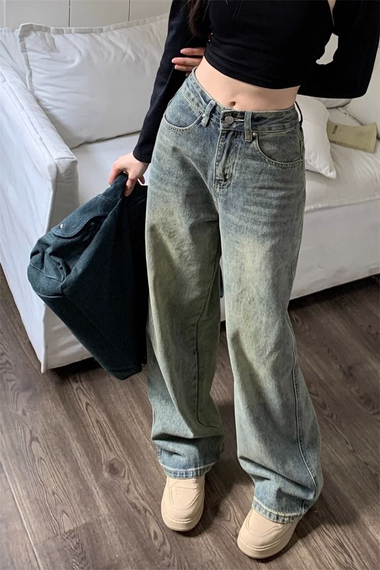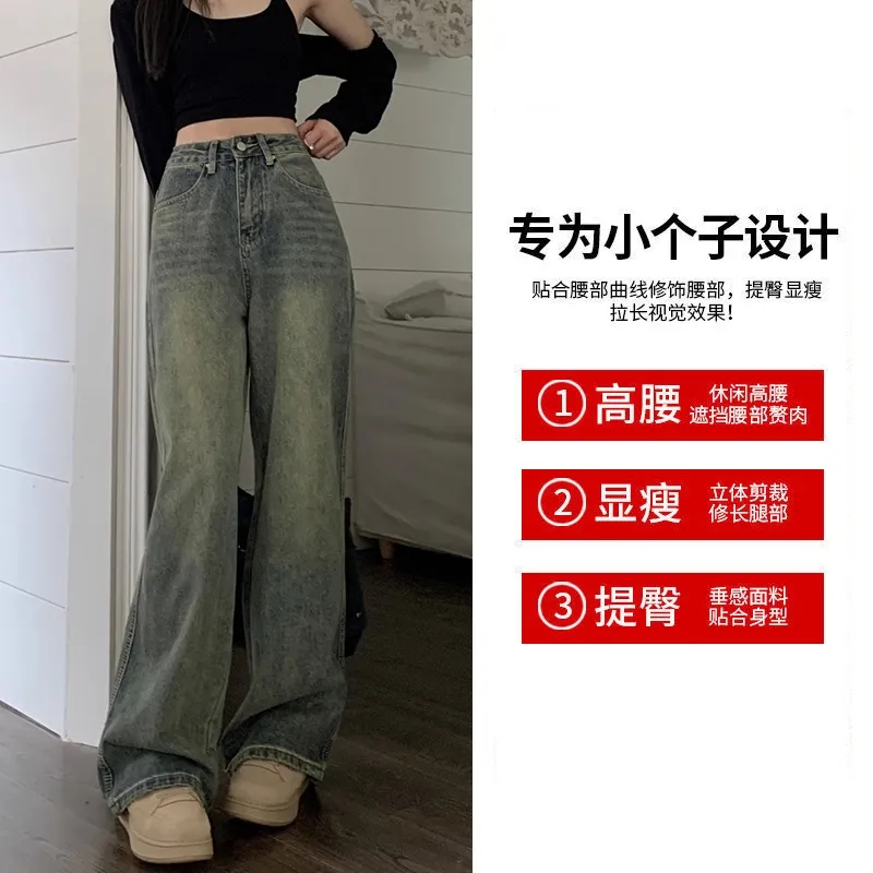 复古水洗做旧牛仔裤女小个子微胖梨形高腰直筒显瘦宽松阔腿拖地裤
