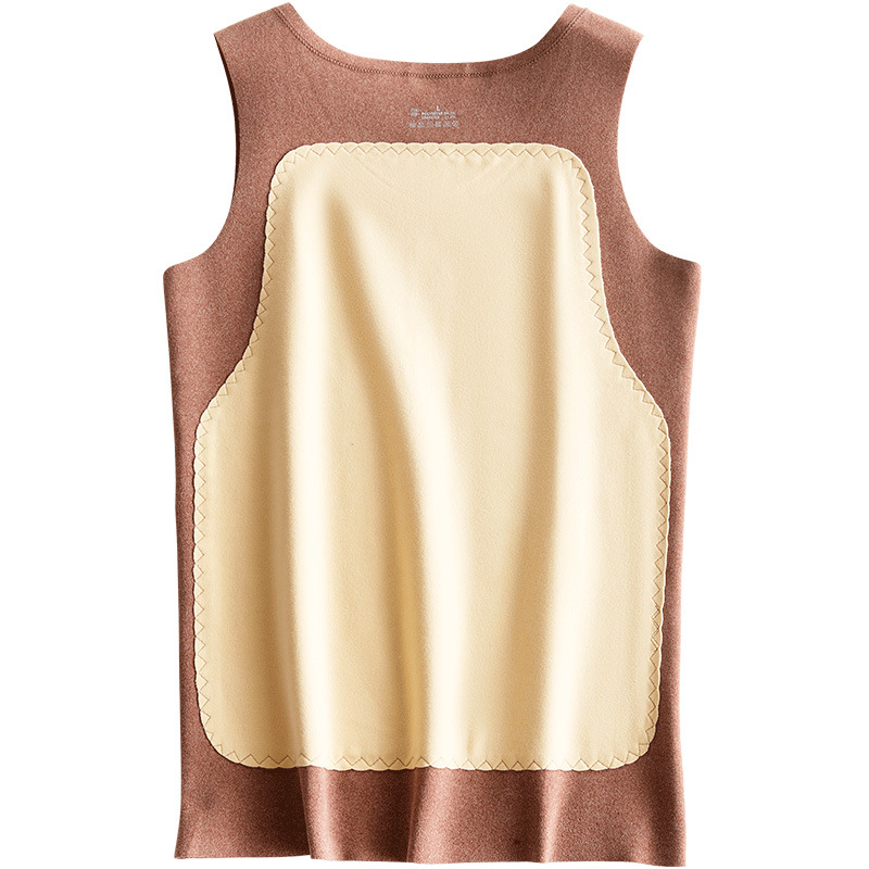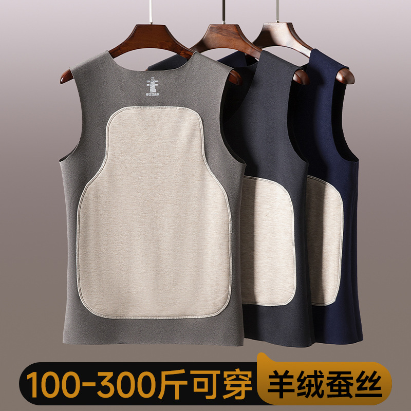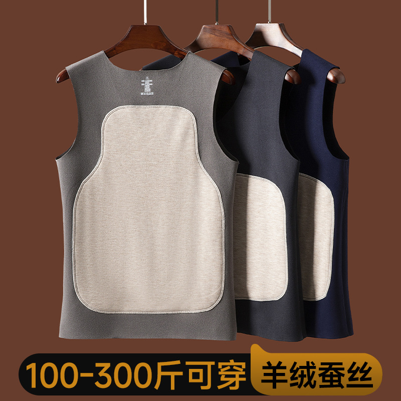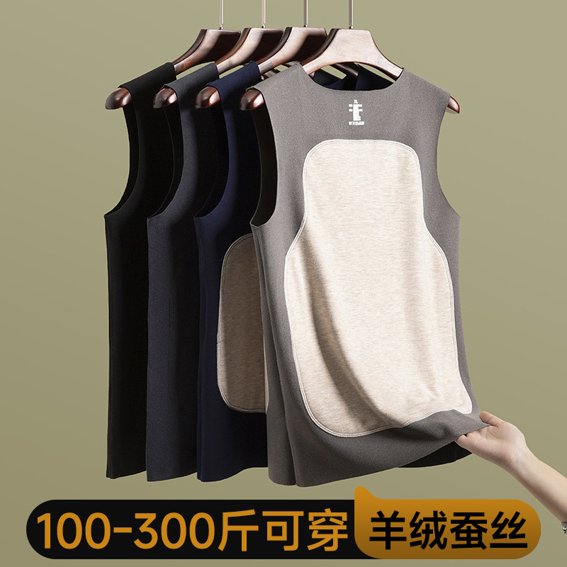 男士蚕丝羊毛贴片保暖背心弹力修身打底内衣V领加绒加厚无袖上衣
