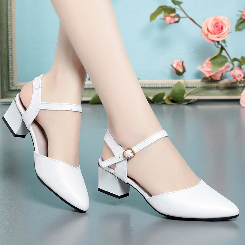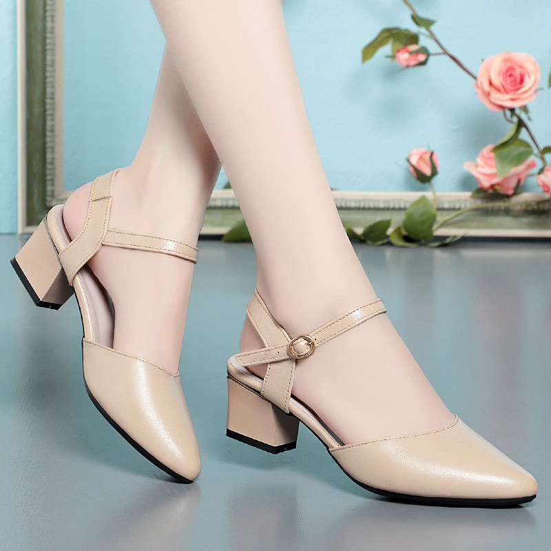 包头凉鞋真皮粗跟尖头单鞋妈妈鞋