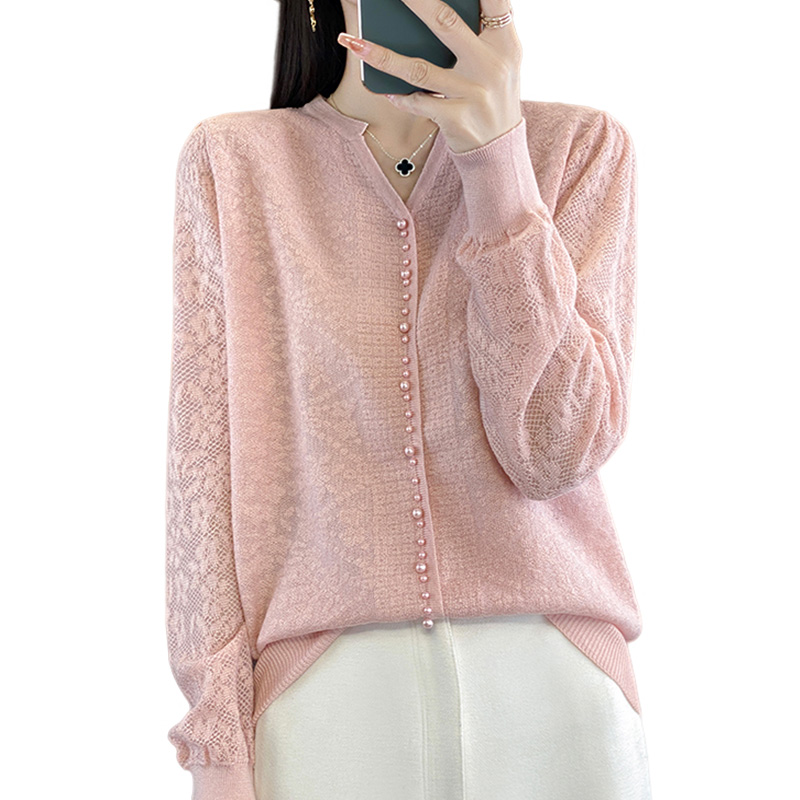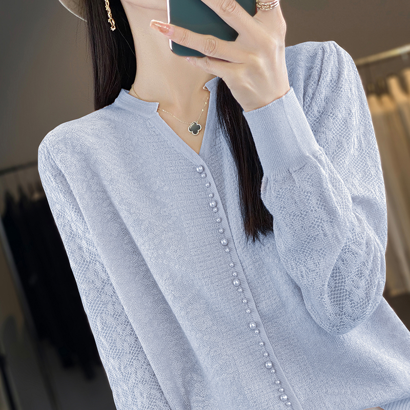 蕾丝打底衫春装2025新款宽松V领洋气钉珠针织衫毛衣女装大码上衣