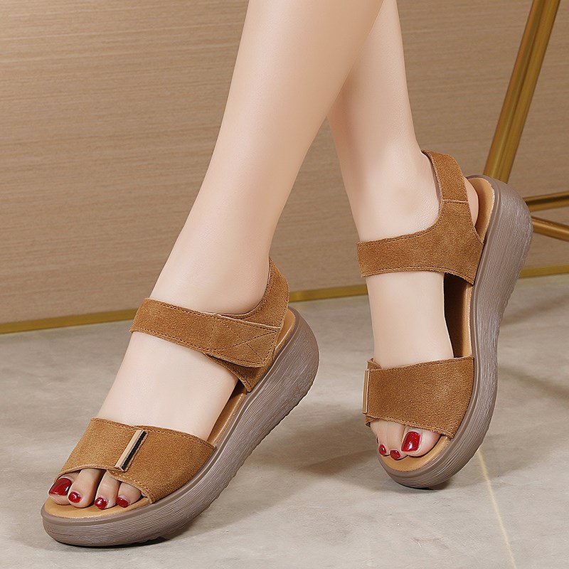 时尚真皮凉拖鞋软底防滑厚底休闲女舒适轻便中跟魔术贴凉鞋妈妈鞋