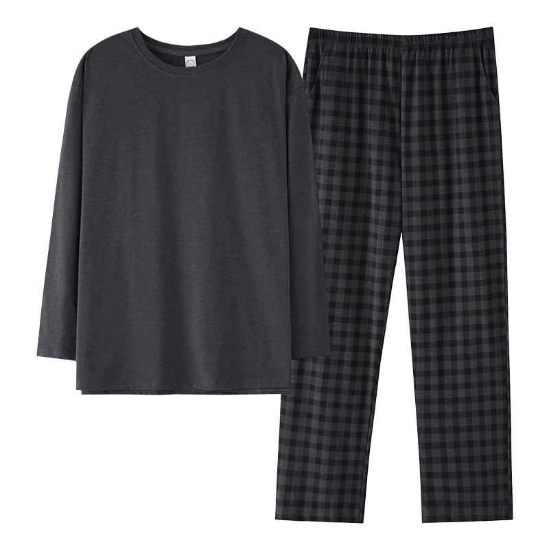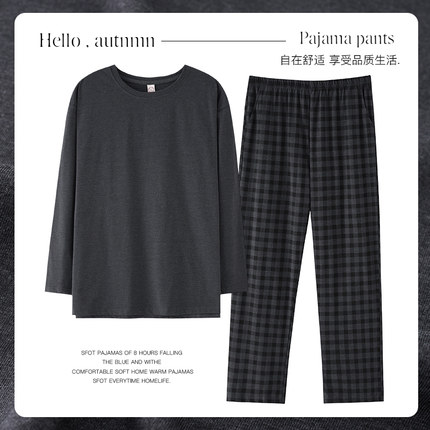 新款睡衣男纯棉春秋季长袖宽松简约格子休闲可外穿套装圆领家居服