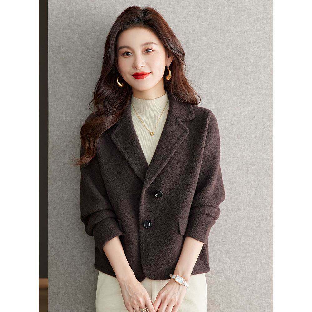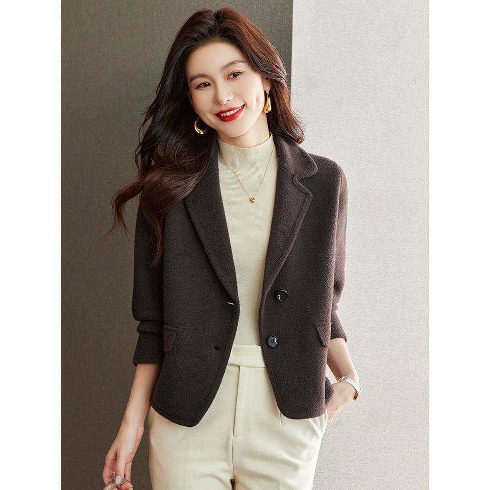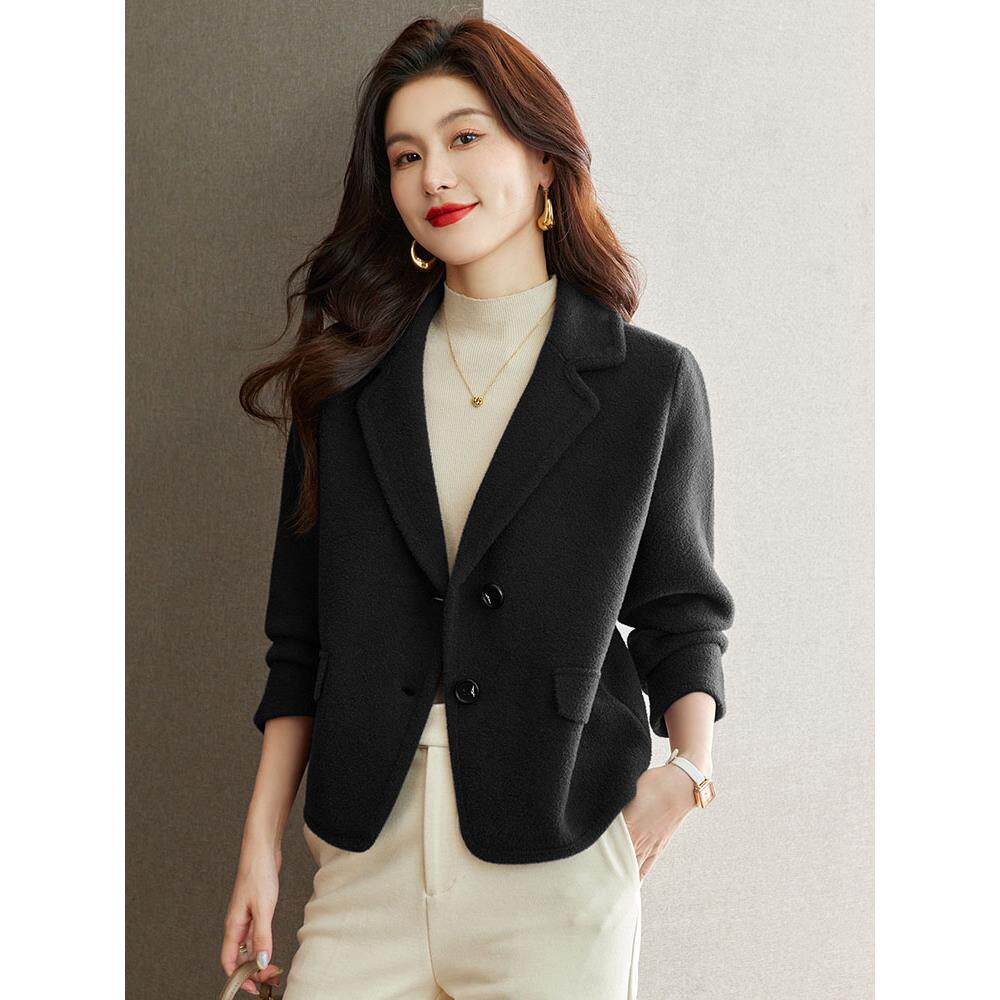 鄂尔多斯市羊毛双面呢大衣女时尚宽松百搭显瘦西装领小个子短外套