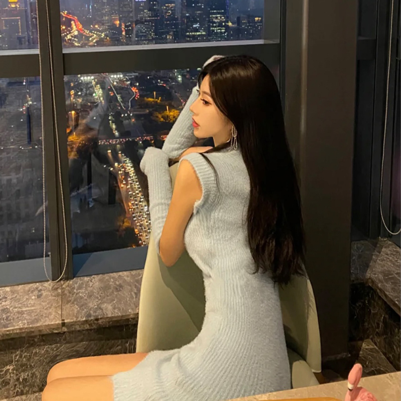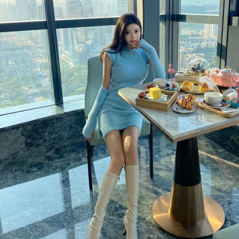 半高领水貂毛纯欲软糯名媛气质针织修身包臀短裙性感连衣裙女秋冬