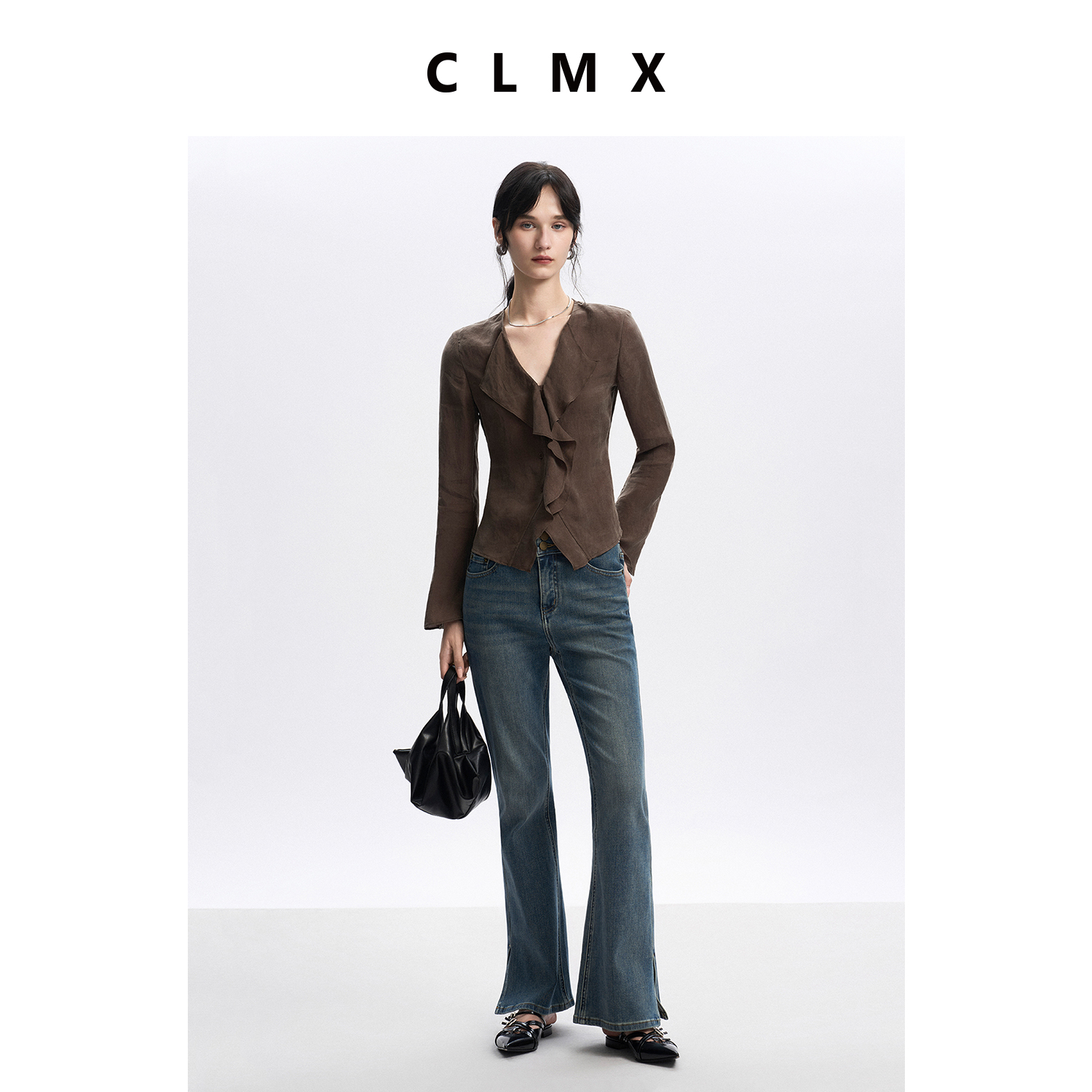 CLMX怀旧水洗复古微喇束腰牛仔裤棉混纺秋季修身通勤裤子女