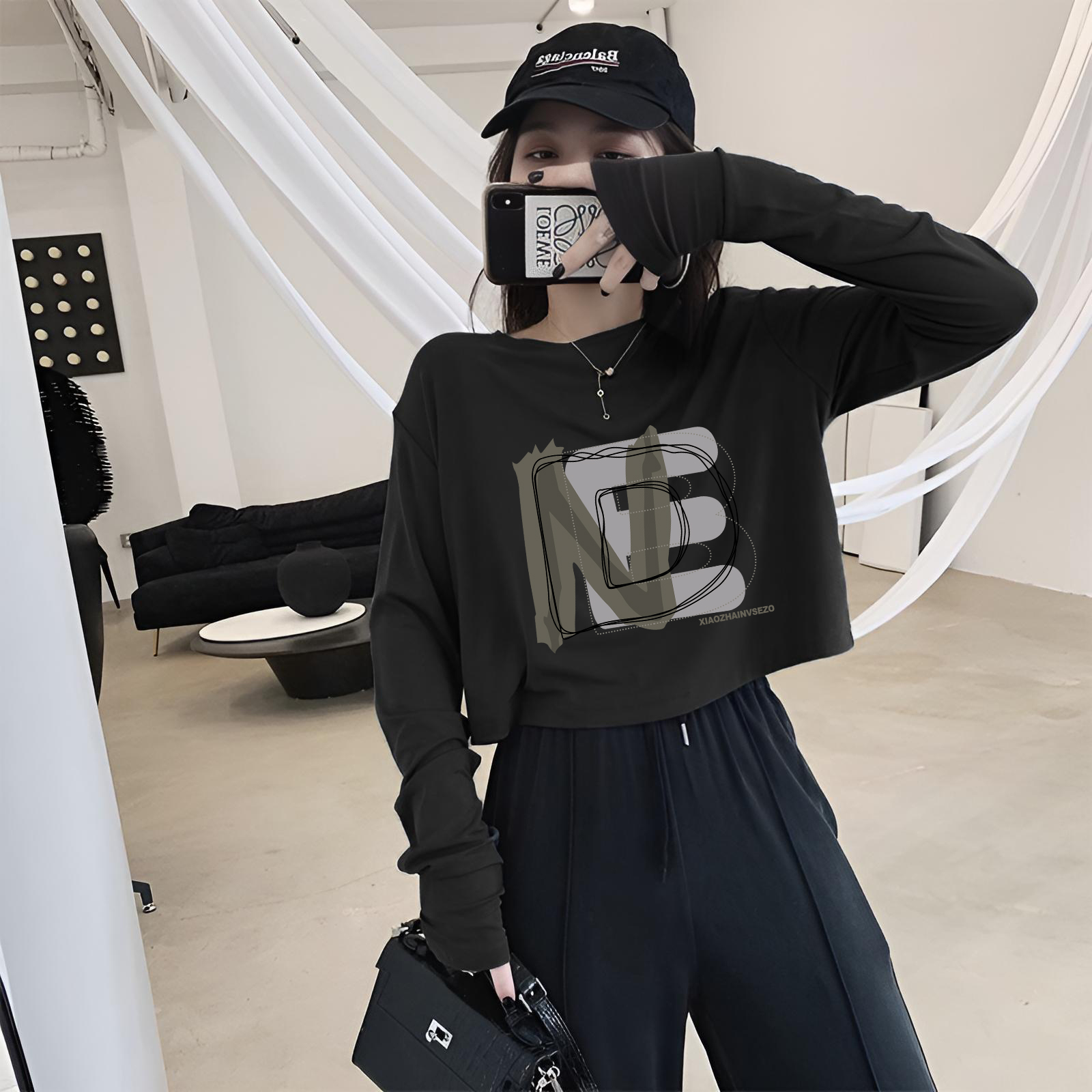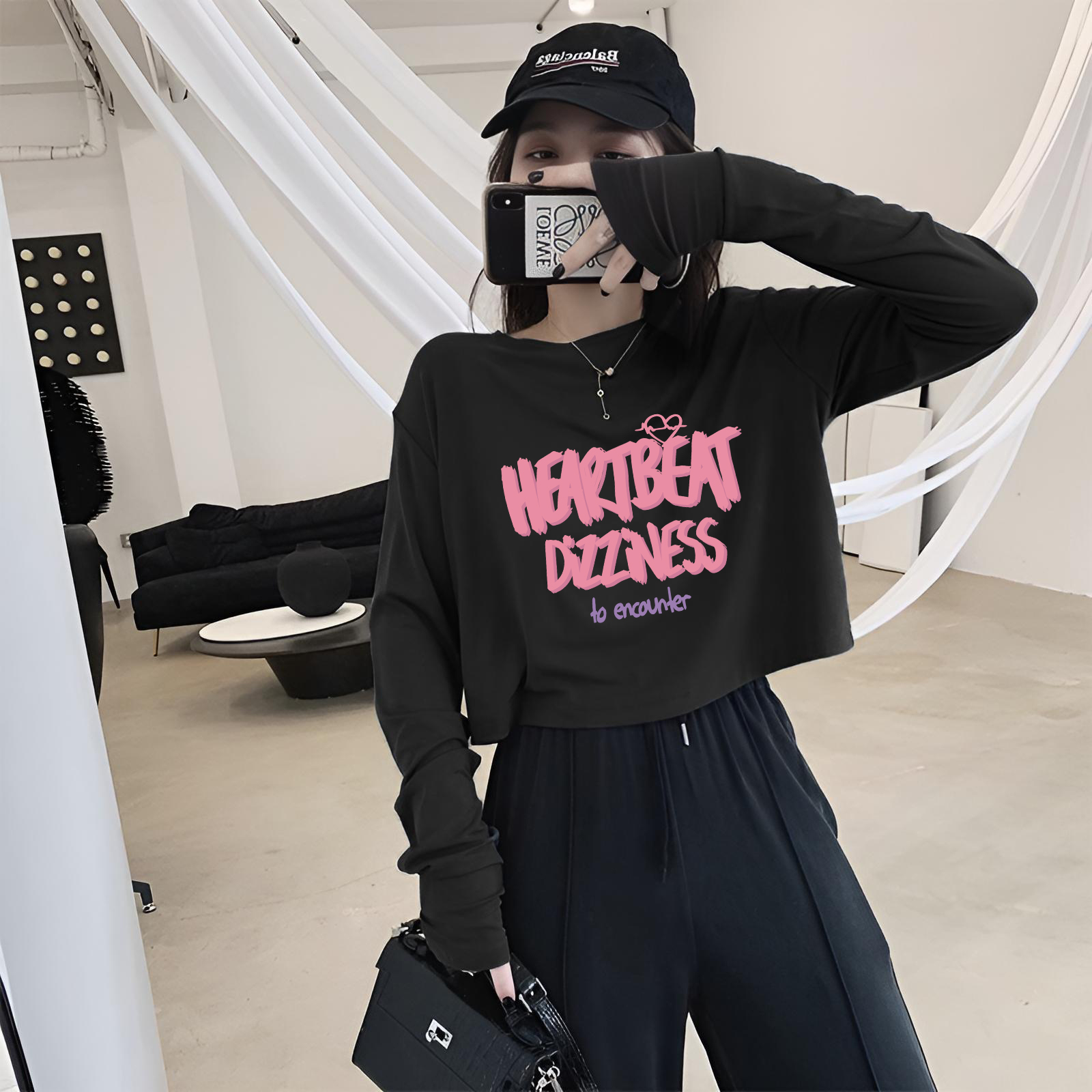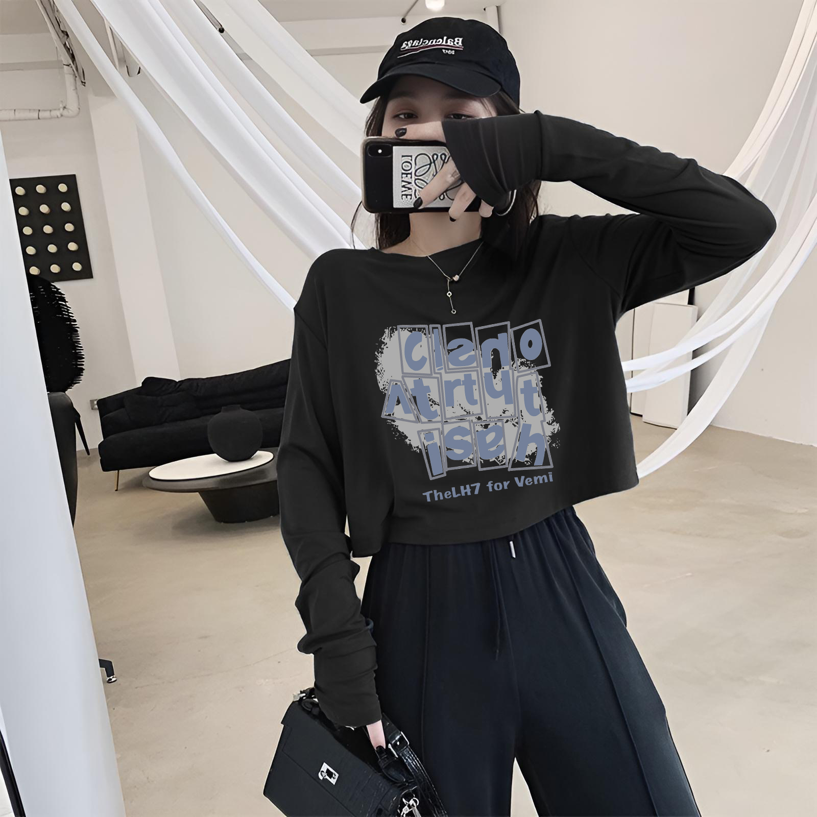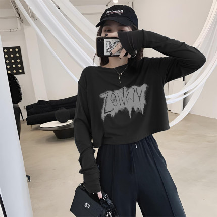 春秋季新款高腰短款t恤女甜酷长袖ins上衣学生韩版宽松百搭打底衫