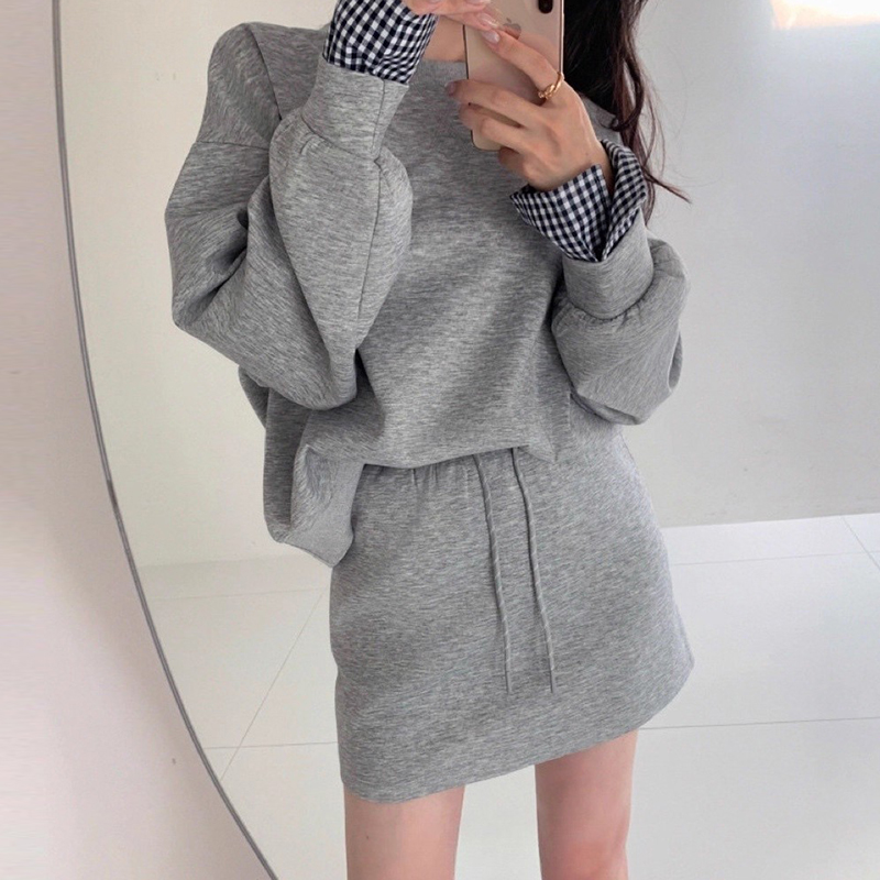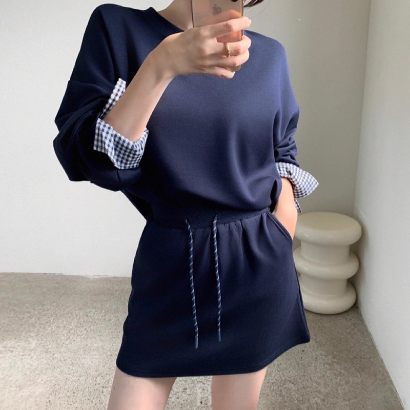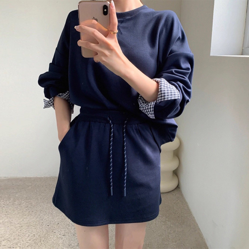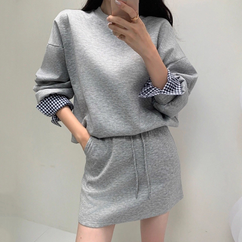 韩国chic秋冬复古减龄宽松拼接格子长袖卫衣+高腰抽绳半身裙套装