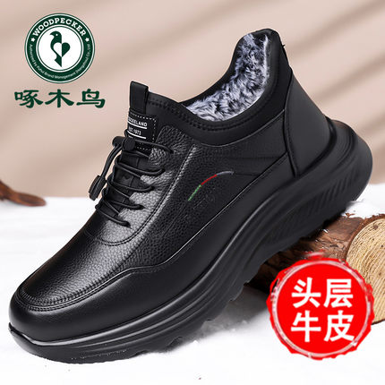啄木鸟男鞋冬季加绒保暖真皮休闲皮鞋防滑软底一脚蹬中老年爸爸鞋