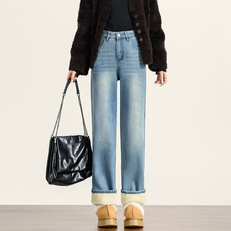 拉夏贝尔浅蓝色加绒窄版直筒牛仔裤女秋冬新款高腰小个子阔腿裤
