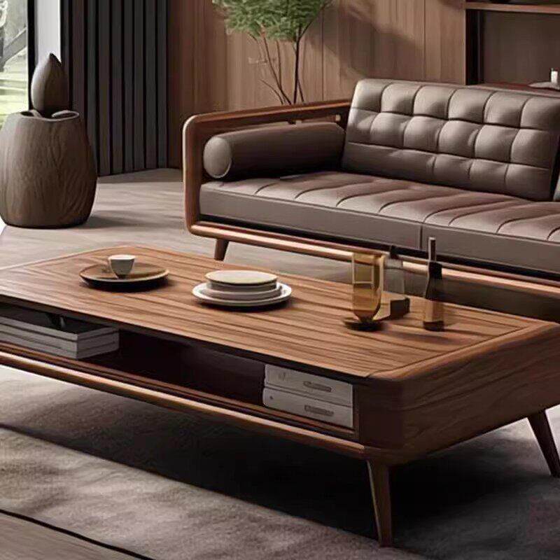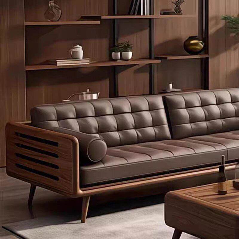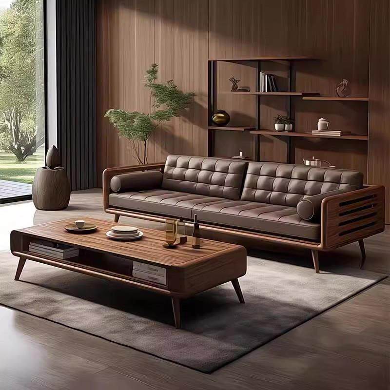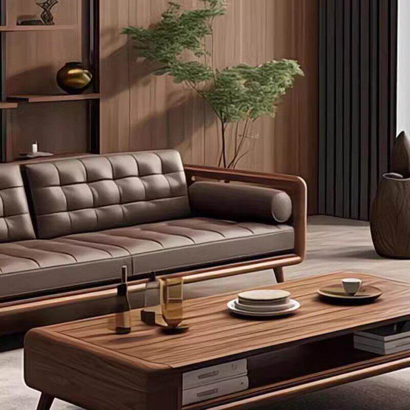新中式北美黑胡桃木沙发客厅现代轻奢皮艺软装办公室实木真皮沙发