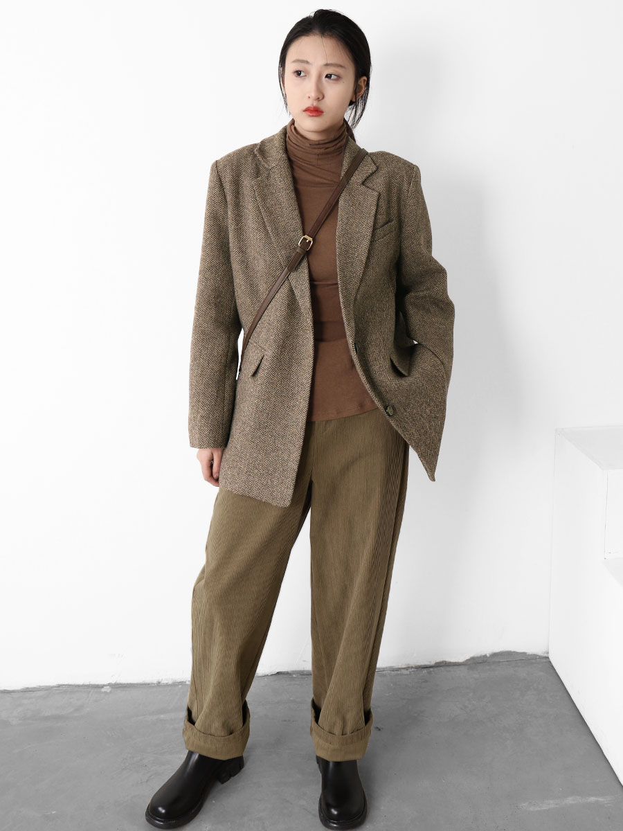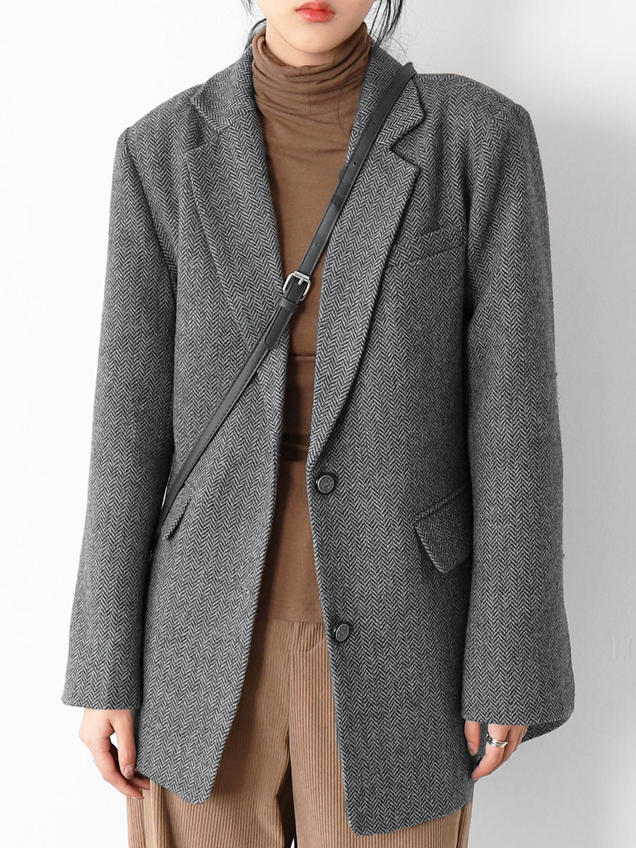 CHICCLO 人字纹呢子西装外套女韩版100%全羊毛复古中长款西服上衣