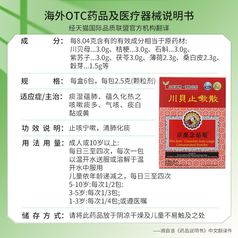 香港版京都念慈菴川贝止嗽散6包止咳宁嗽清肺化痰感冒咳嗽药正品