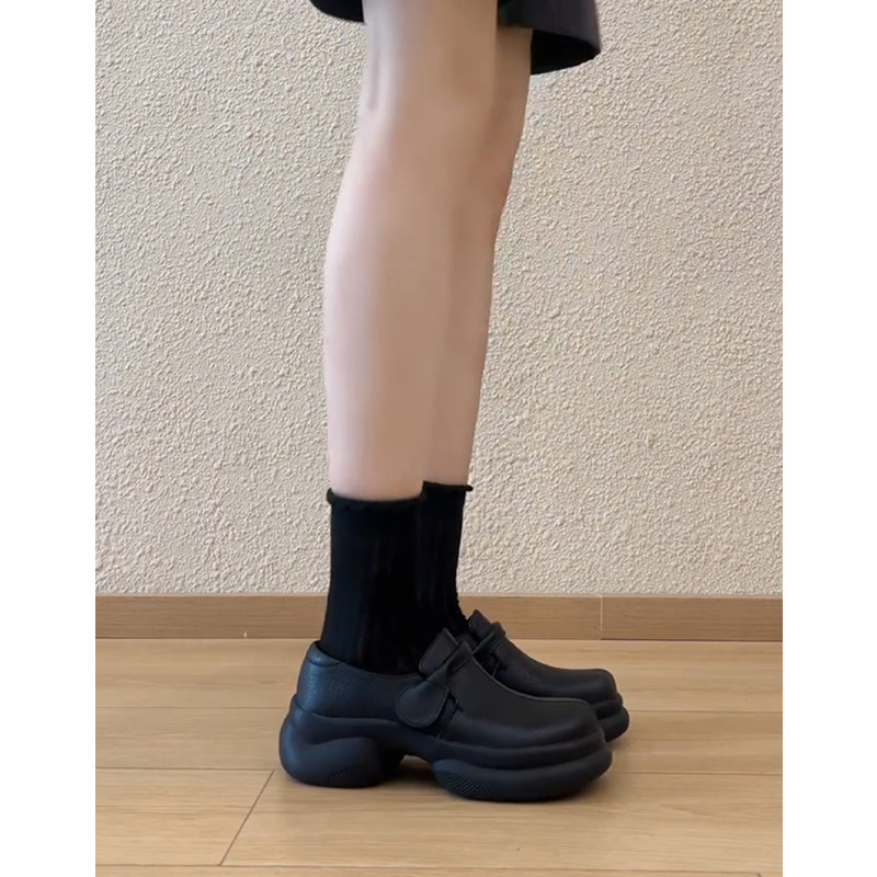 羊皮版~真皮英伦厚底增高圆头魔术贴乐福鞋女复古黑色小皮鞋单鞋