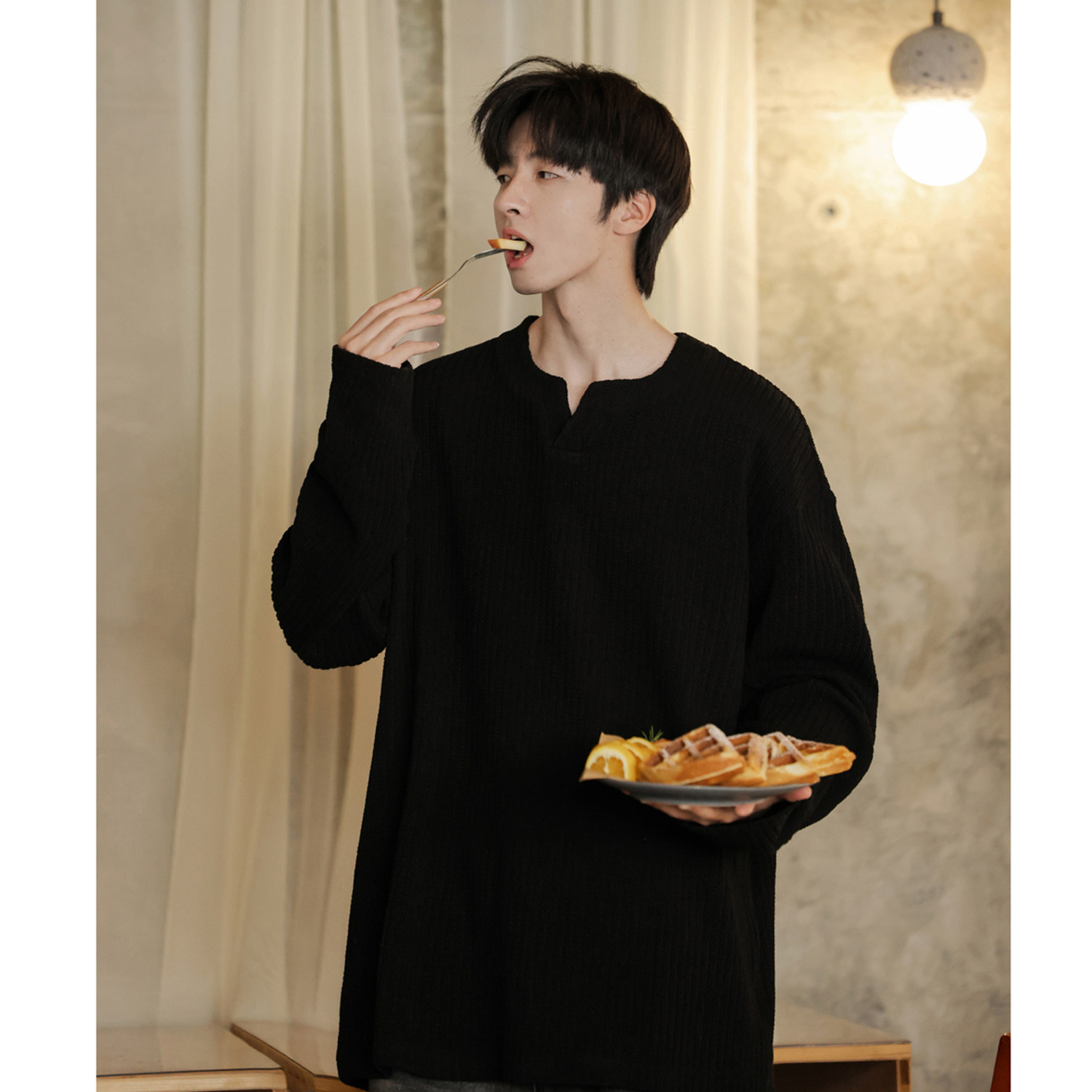 唐狮集团DESSO纯色小v领长袖T恤男秋季2025新款宽松休闲潮牌上衣