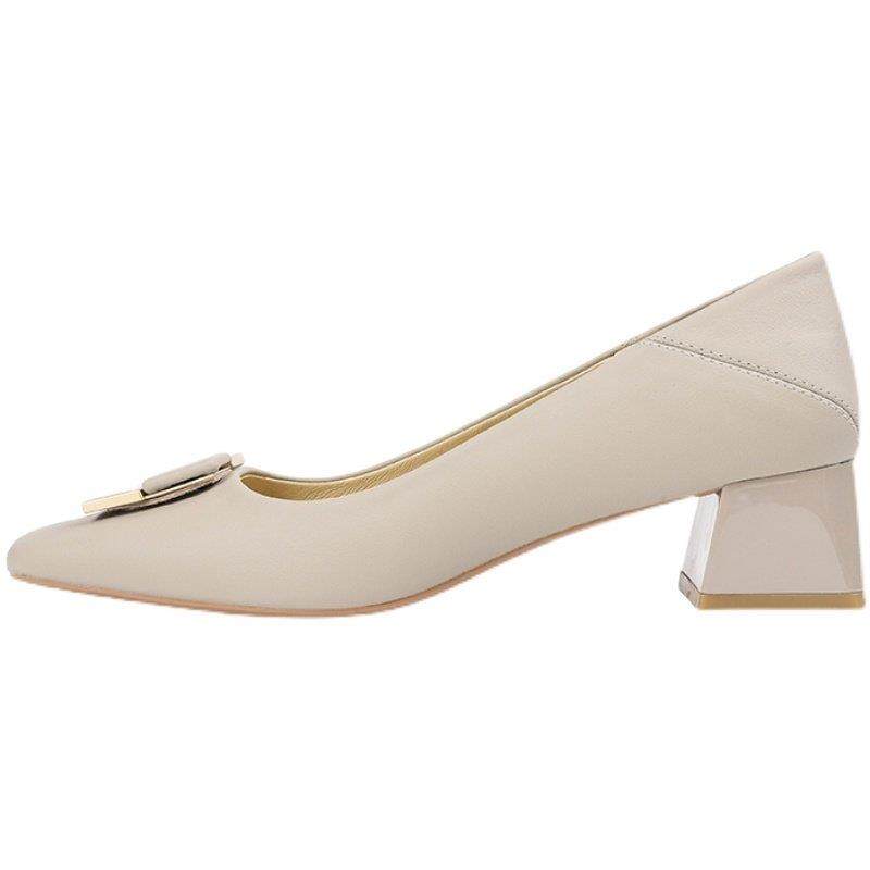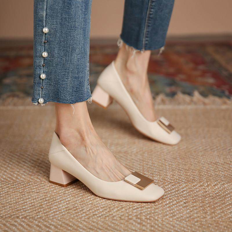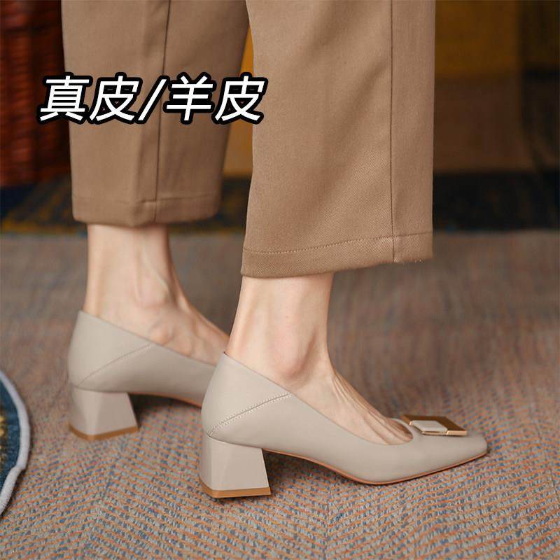 香港百搭高跟鞋女粗跟中跟浅口单鞋2025年春季新款小方头时尚女鞋