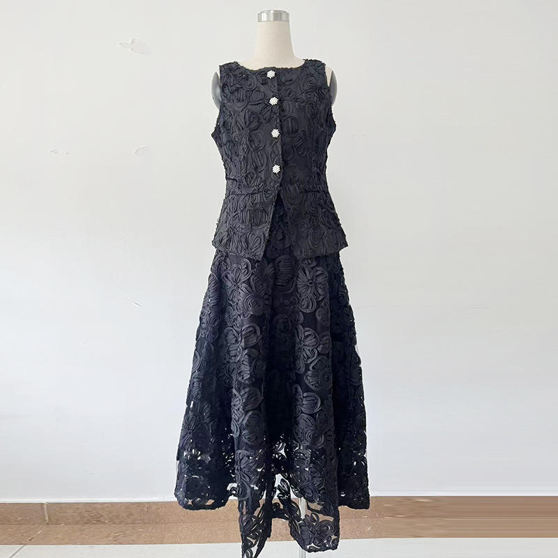 法式温柔风两件套蕾丝勾花无袖上衣+高腰显瘦字裙套装女时尚套装