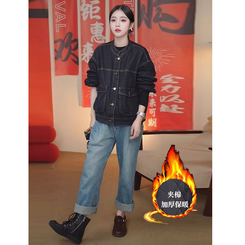 夹棉牛仔外套女冬季港风复古保暖加厚棉衣棉服短款工装夹克上衣潮
