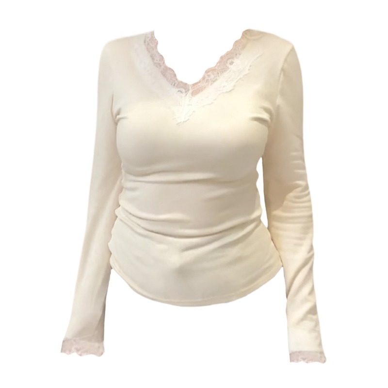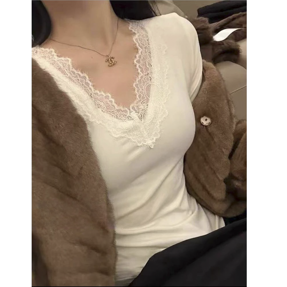 大码胖mm蕾丝V领长袖加厚磨毛打底衫T恤女秋冬高级感内搭修身上衣