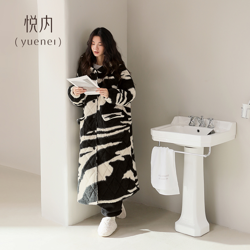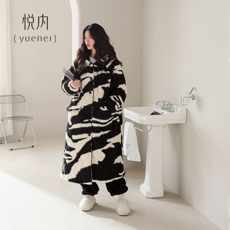 悦内睡袍女睡衣秋冬款冬季冬天珊瑚绒三层夹棉加绒加厚长款可外穿
