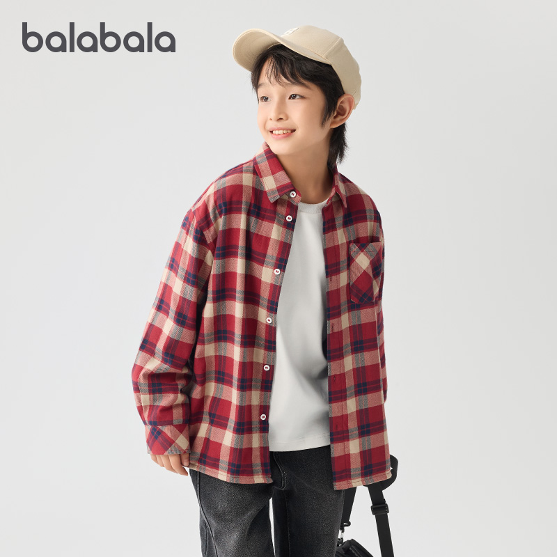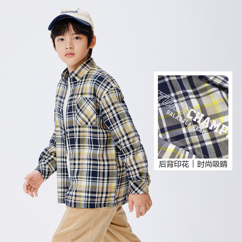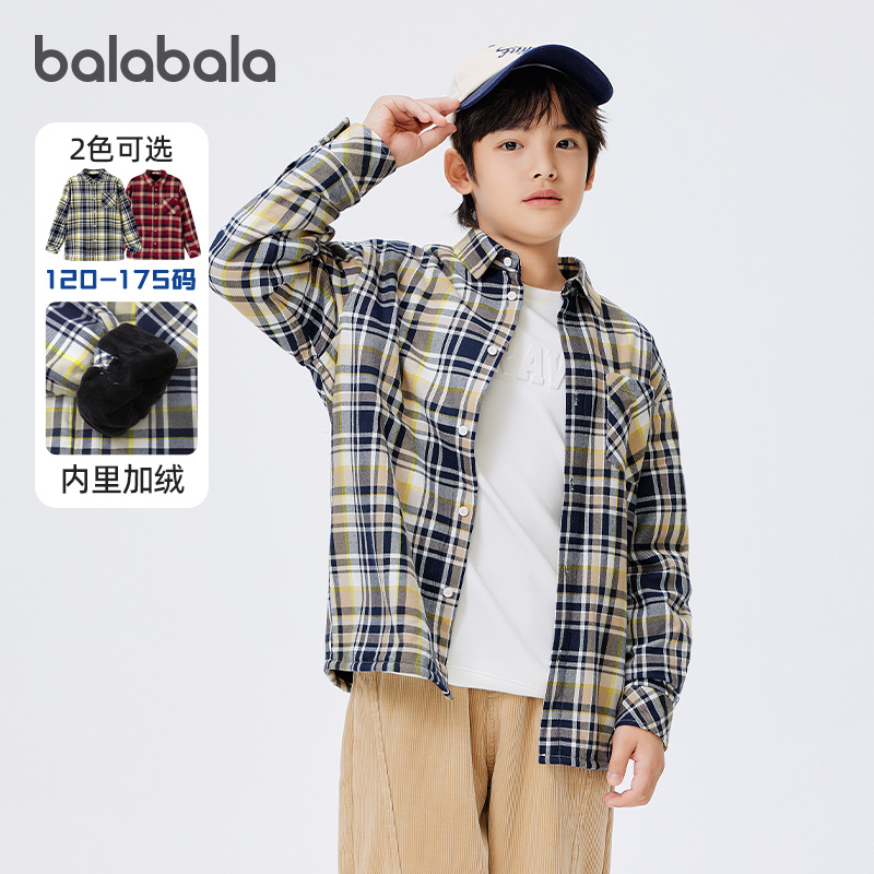 巴拉巴拉男童长袖衬衫儿童加绒格子衬衣冬装新款童装中大童外套厚