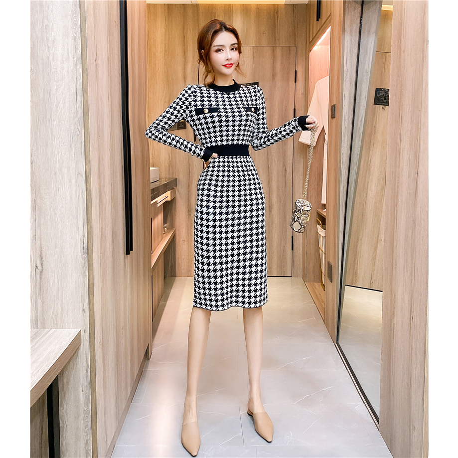 实拍长袖连衣裙新款气质格子收腰显瘦黑色毛衣针织裙子女秋冬