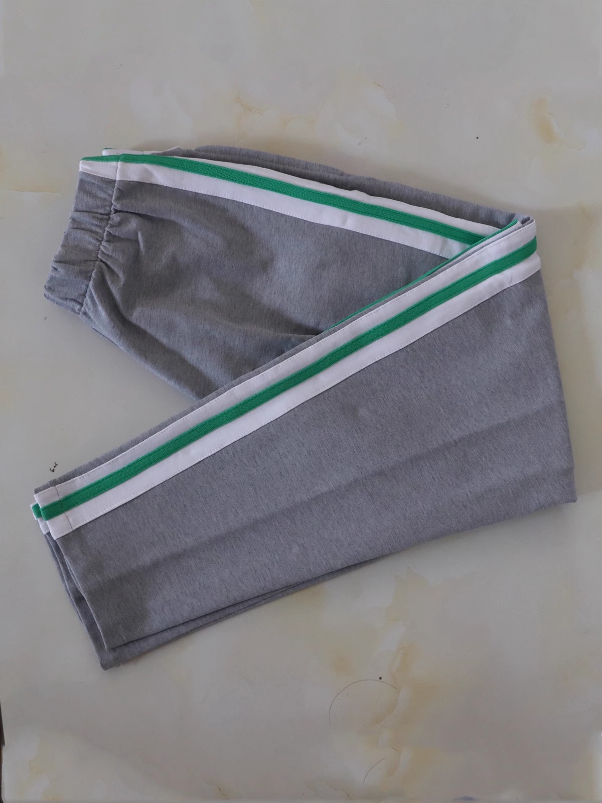 浅灰色拼白宽杠压草绿条校服长裤