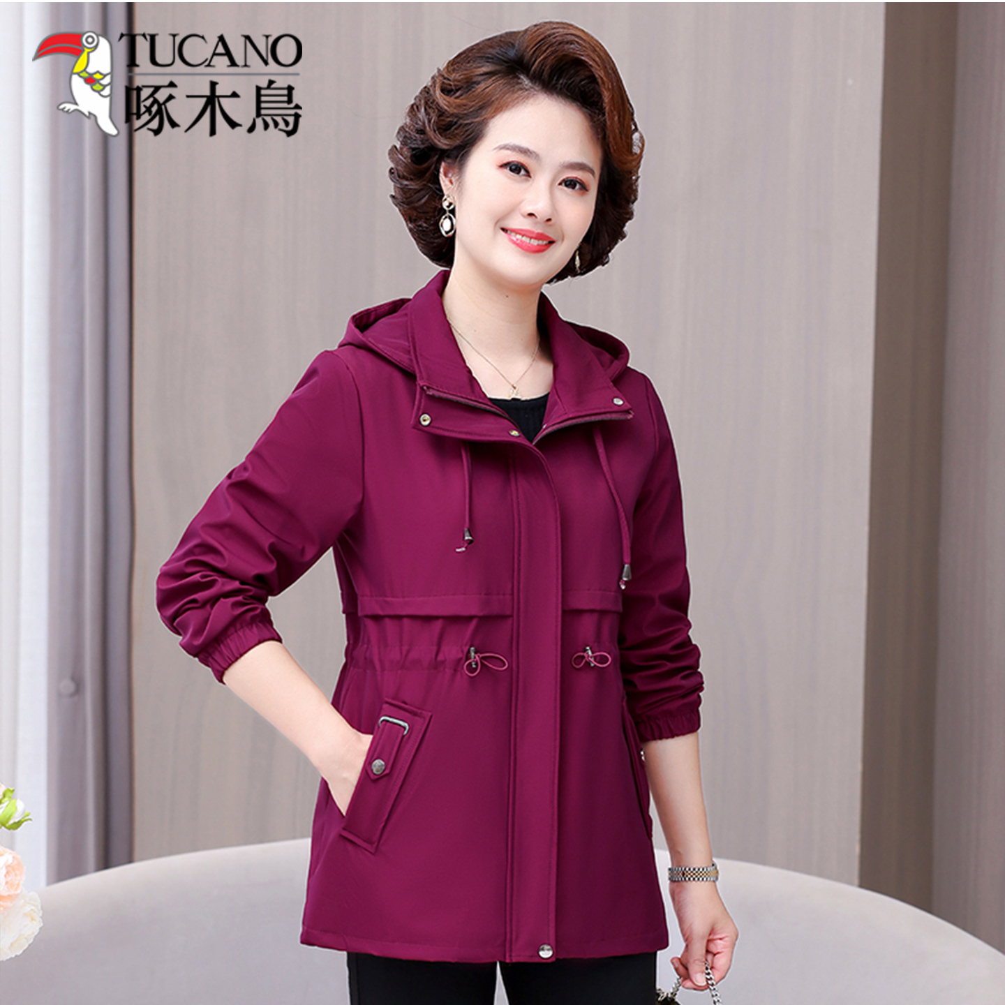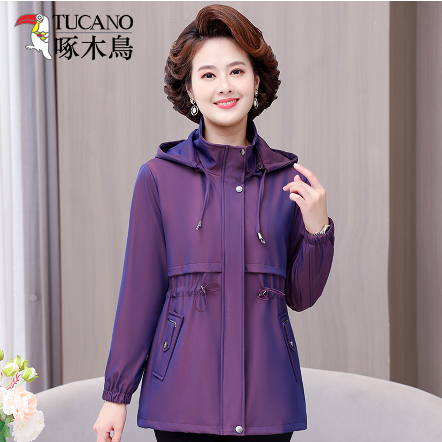 啄木鸟中老年女装薄款洋气妈妈连帽宽松翻领减龄中年风衣外套上衣