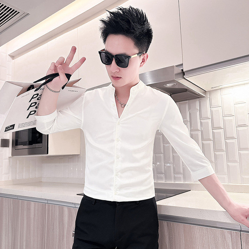夏季七分袖衬衫男款修身立领中袖2025新款痞帅高级感潮牌短袖衣服