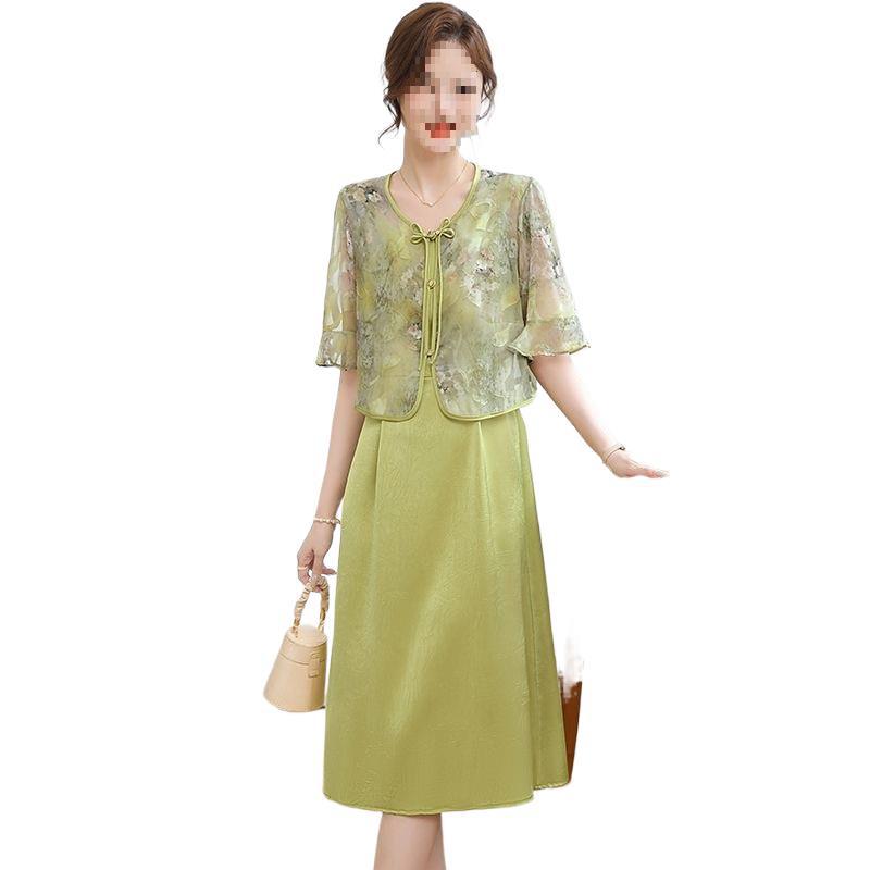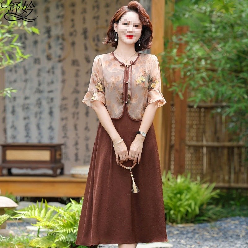 妈妈夏装连衣裙过膝两件套新中式中老年短袖遮肚显瘦裙子套装洋气