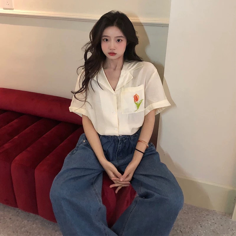 大码胖妹妹夏日郁金香刺绣雪纺短袖衬衫女夏天薄款复古设计感上衣