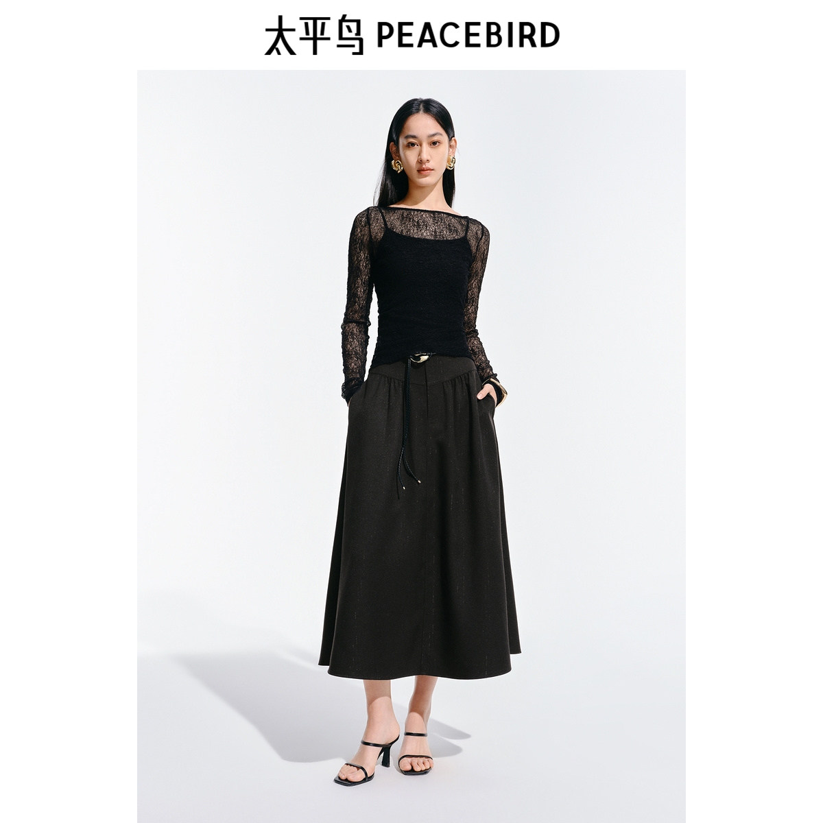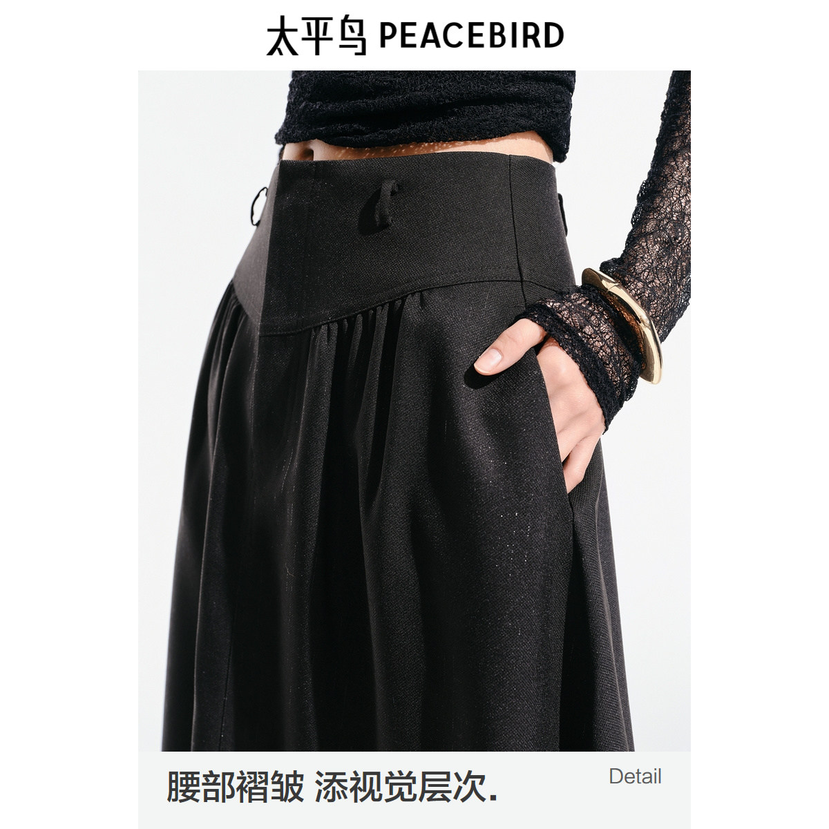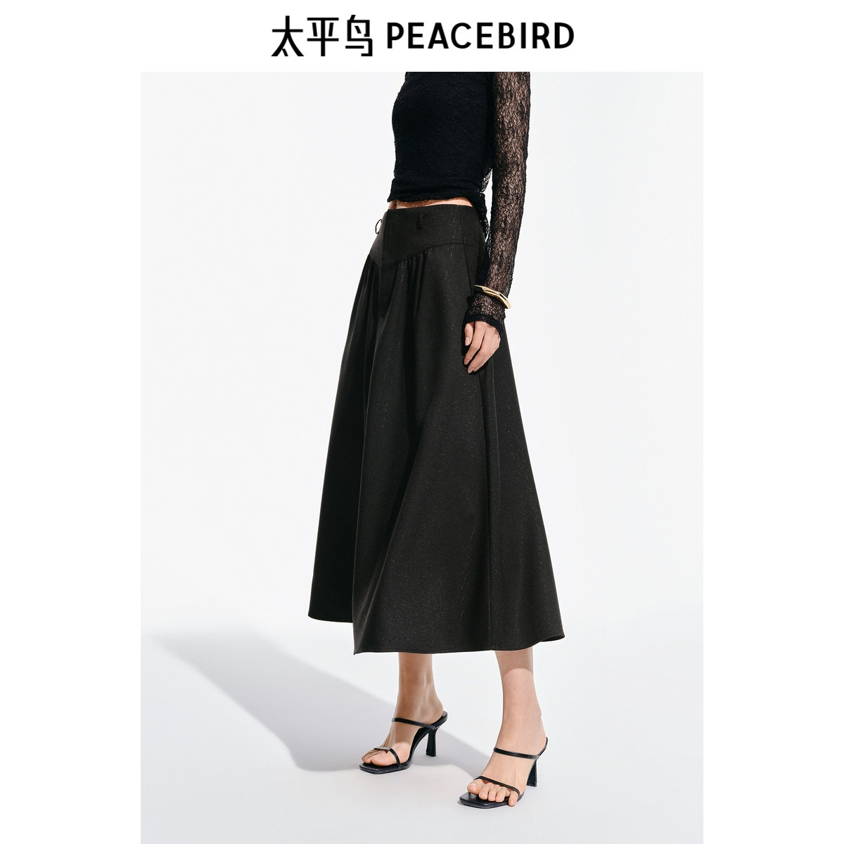 太平鸟亮丝肌理感半身裙女2025夏A字伞裙时尚气质黑色长裙