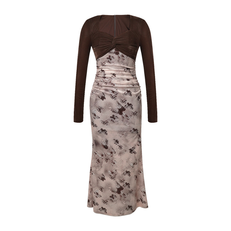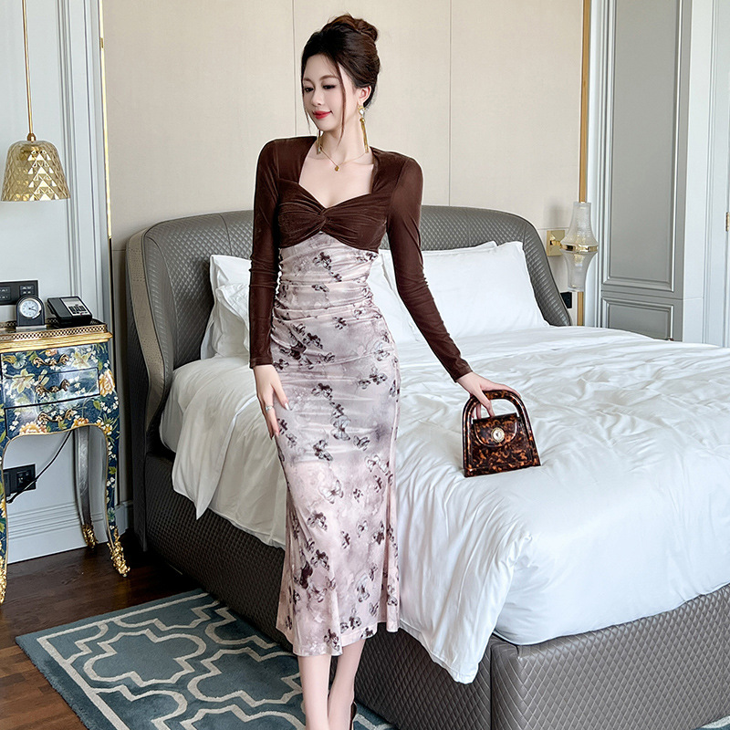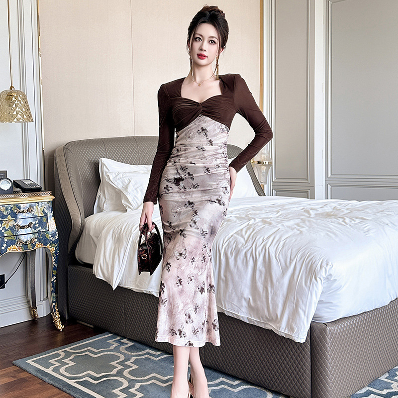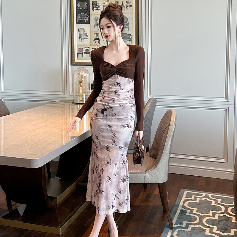 2025秋冬装新款法式复古方领修身包臀丝绒印花连衣裙打底裙21444