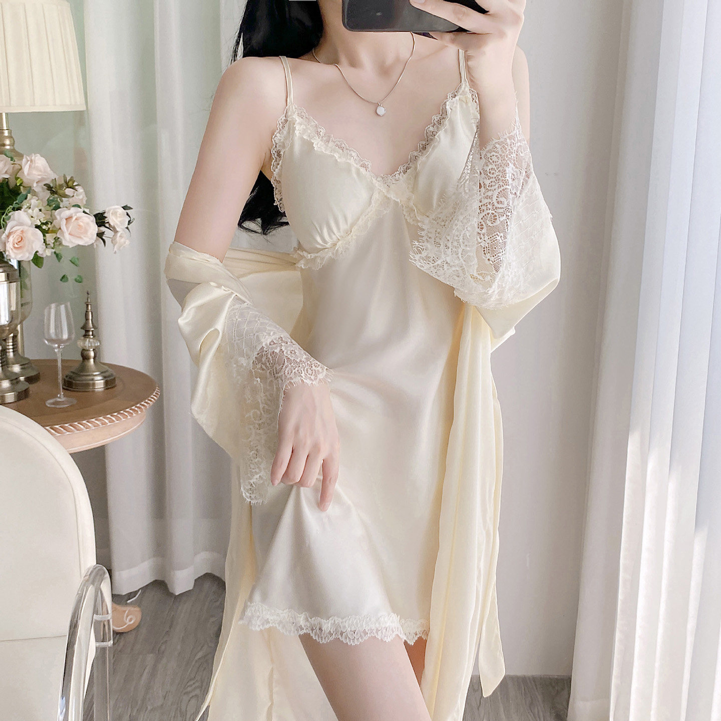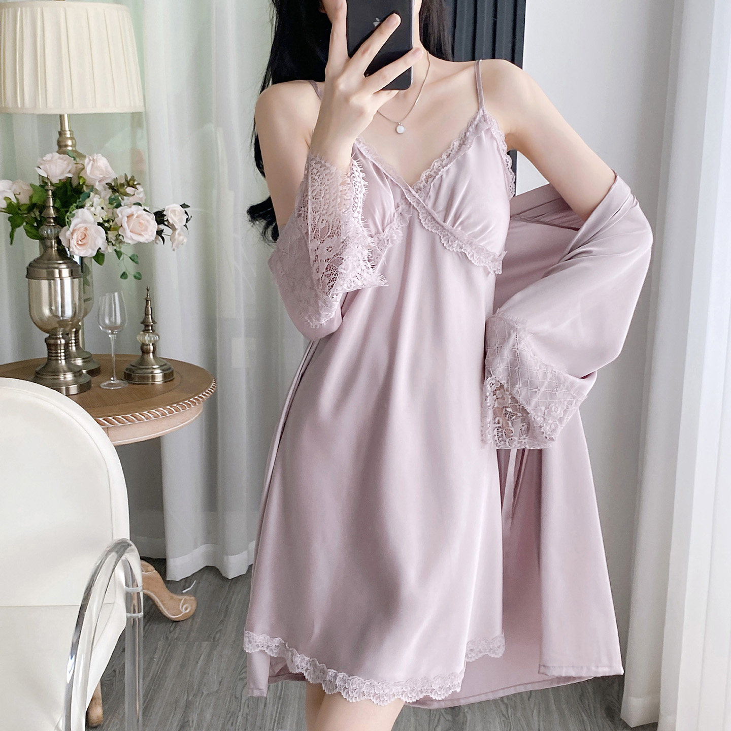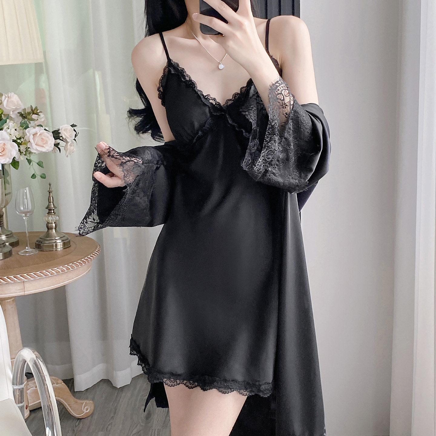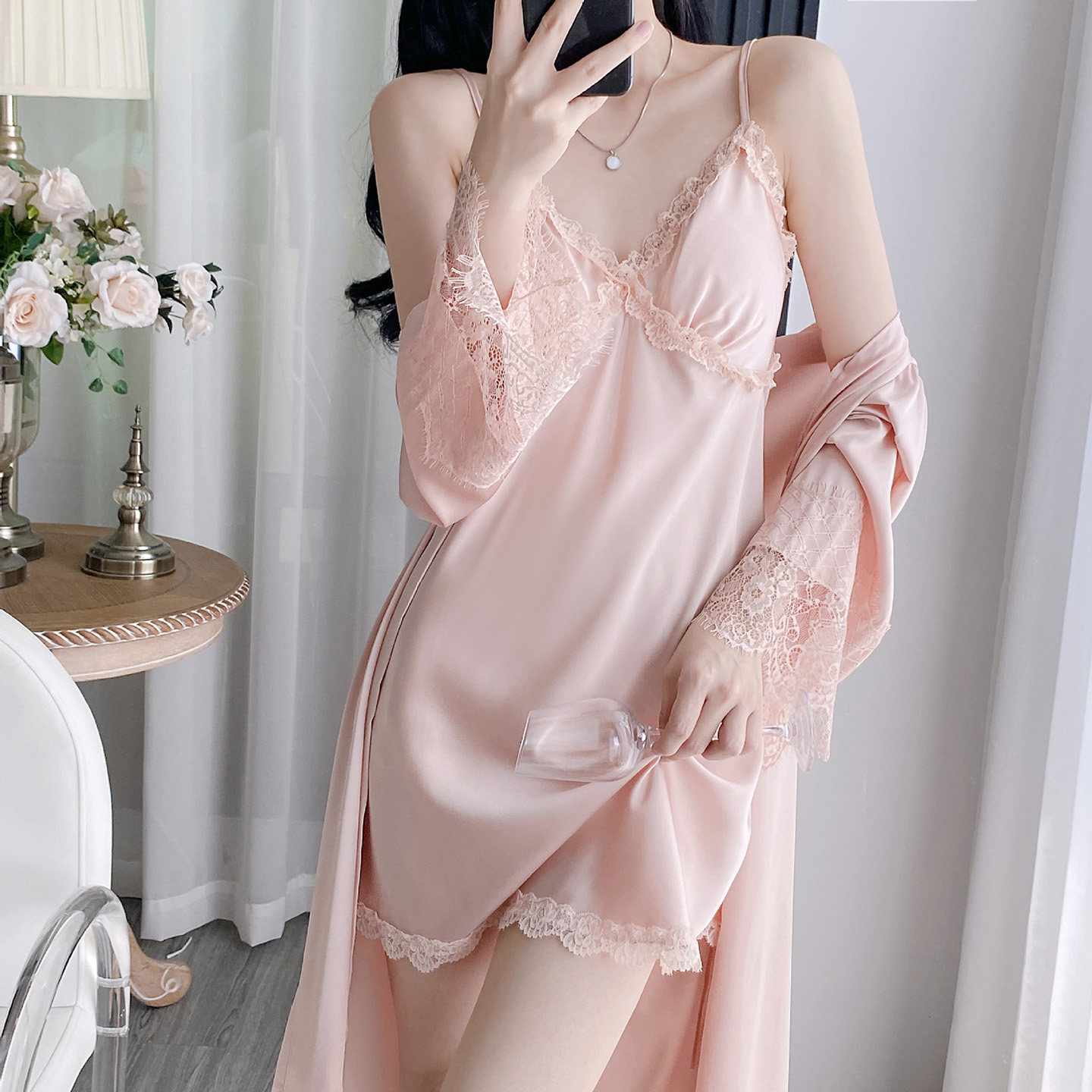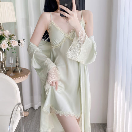 睡衣女款2025新款夏季性感纯欲蕾丝吊带胸垫冰丝绸睡裙春秋家居服