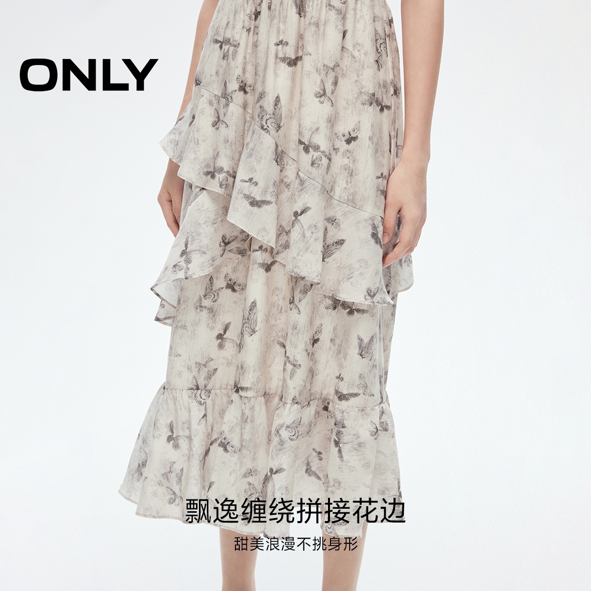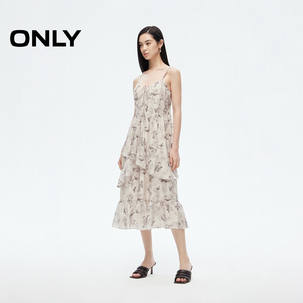 ONLY2025秋季新款度假风蝴蝶印花仙女荷叶边收腰吊带长裙连衣裙女