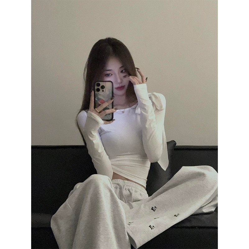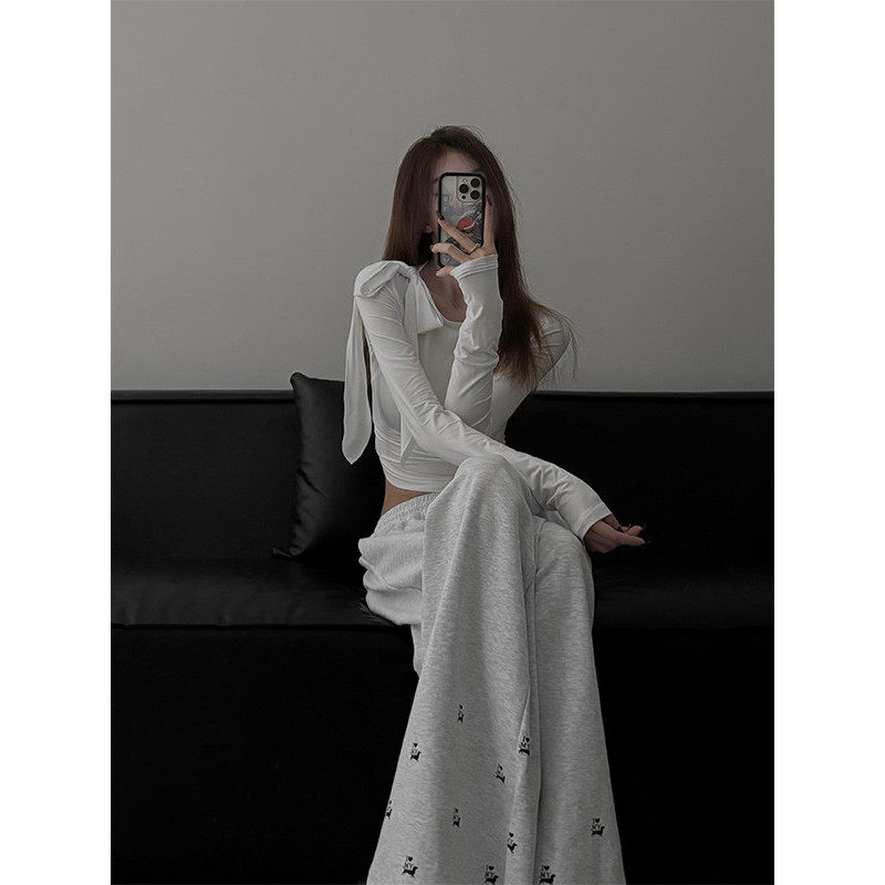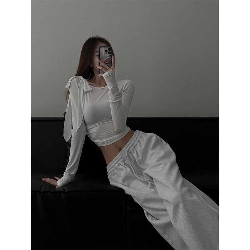 大码胖mm美式辣妹蝴蝶结绑带长袖t恤女春季修身显瘦短款内搭上衣