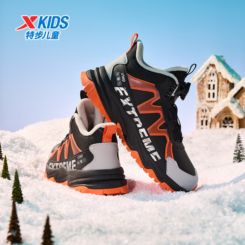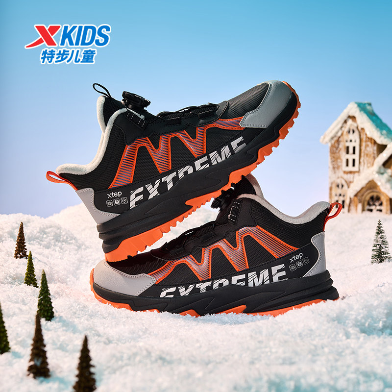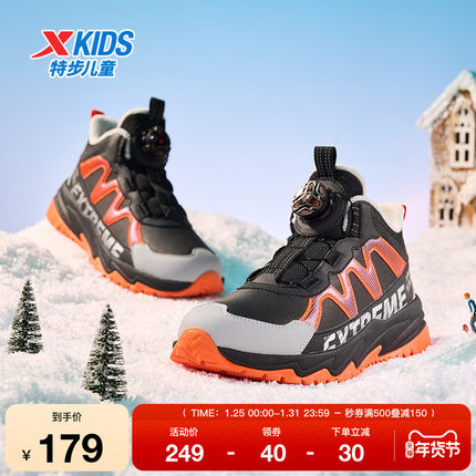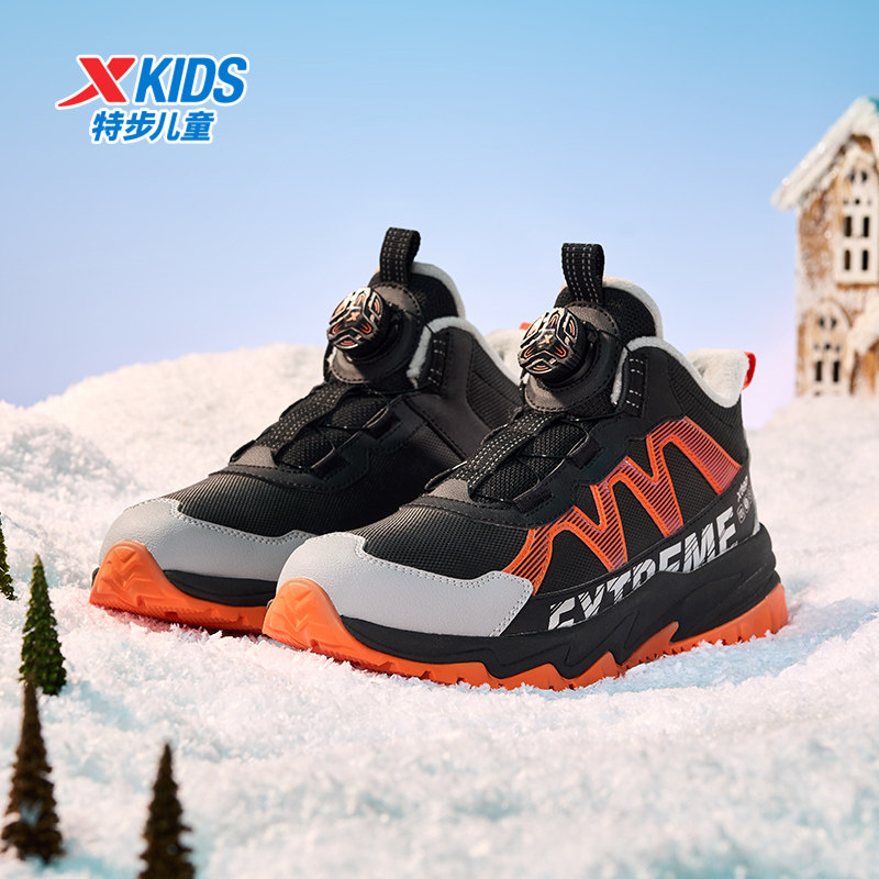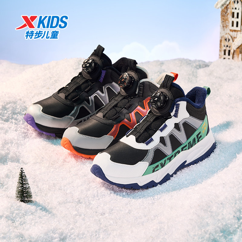 特步童鞋冬季男童中大童运动旋转扣加绒内里防滑耐磨百搭儿童棉鞋