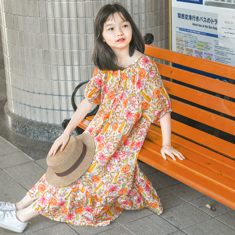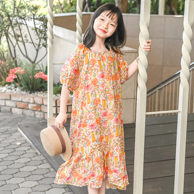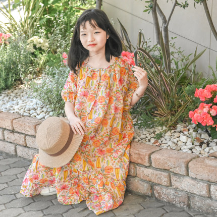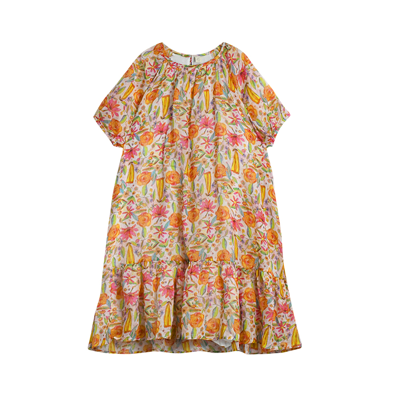 蔡爸爸童装2025款夏装文艺小个子女装碎花裙纯苎麻黄色连衣裙609